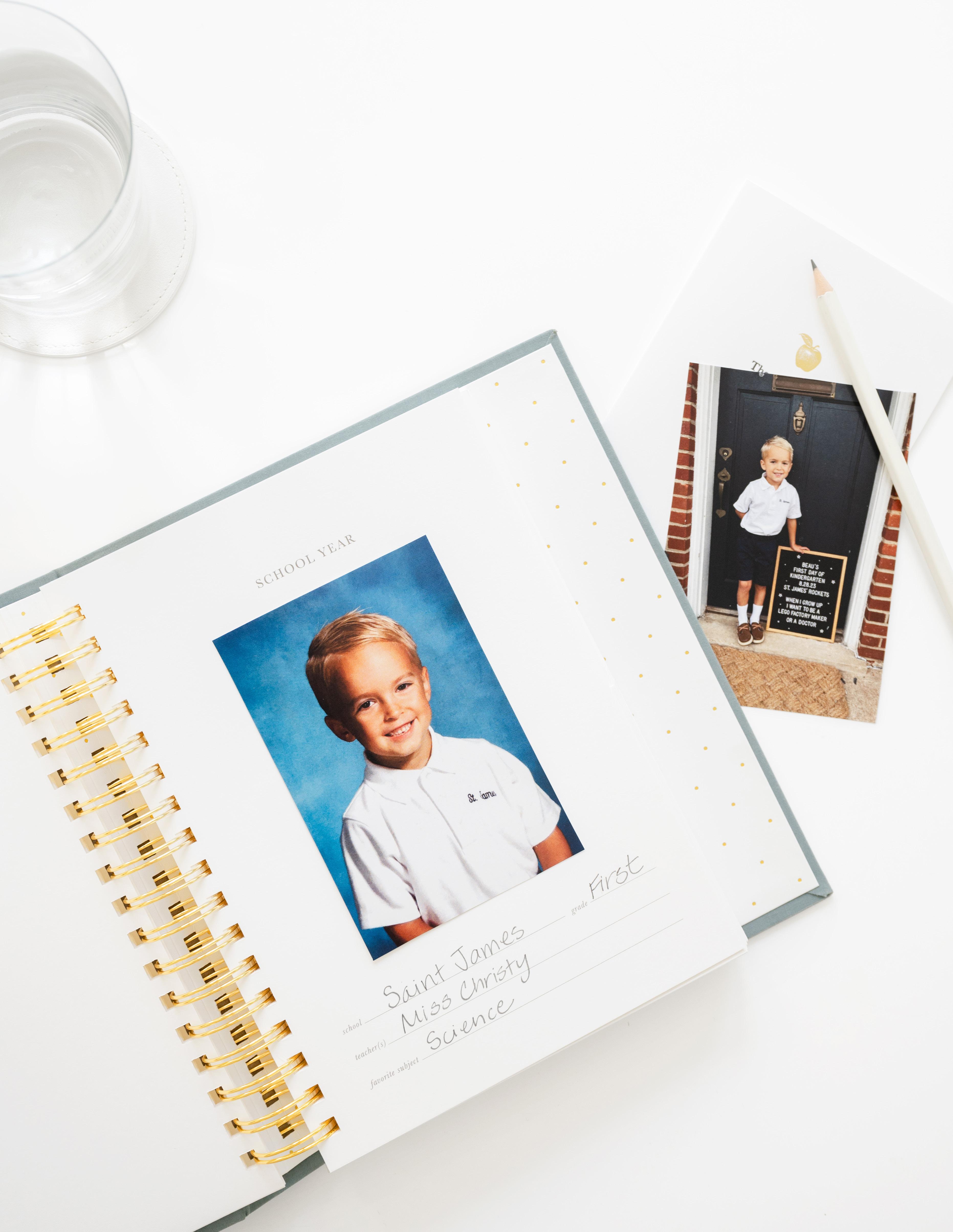 CONCEALED GOLD SPIRAL BINDING, KEEPSAKE GIFT BOX, SPOTS FOR SCHOOL MEMORIES FROM KINDERGARTEN TO 12TH GRADE, POCKETS FOR SCHOOL KEEPSAKES AND REPORT CARDS