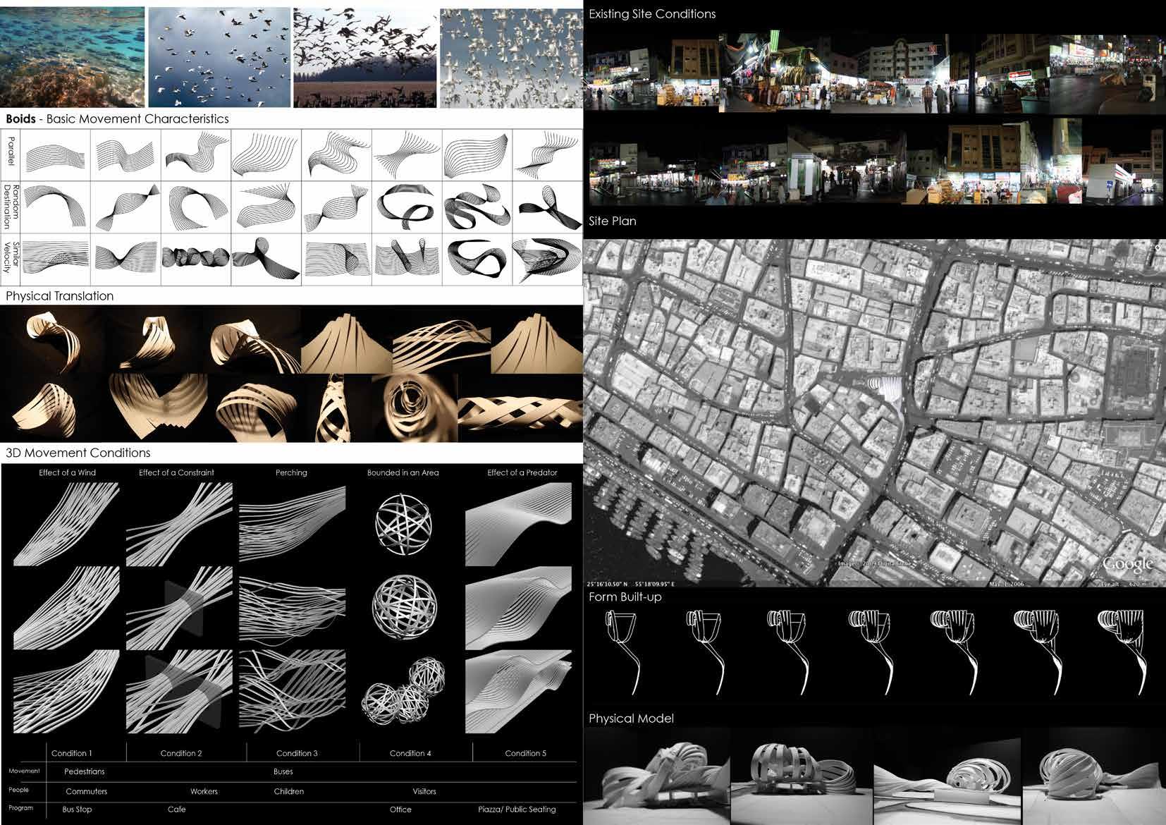 A set of two key words was given to start the initial research stage. The key words assigned were ‘Network of Transition Spaces’ and ‘Laminations’. I chose to study the behaviors of boids, the flocking behavior of birds in interaction with their environments and various obstacles. A set of 2D and 3D studies let to various patterns of the visual language. These patterns were associated with various self- generated program and hence a device was formed to produce an individual contextualized variation of the system.