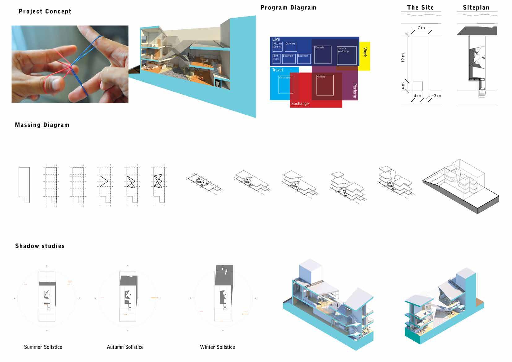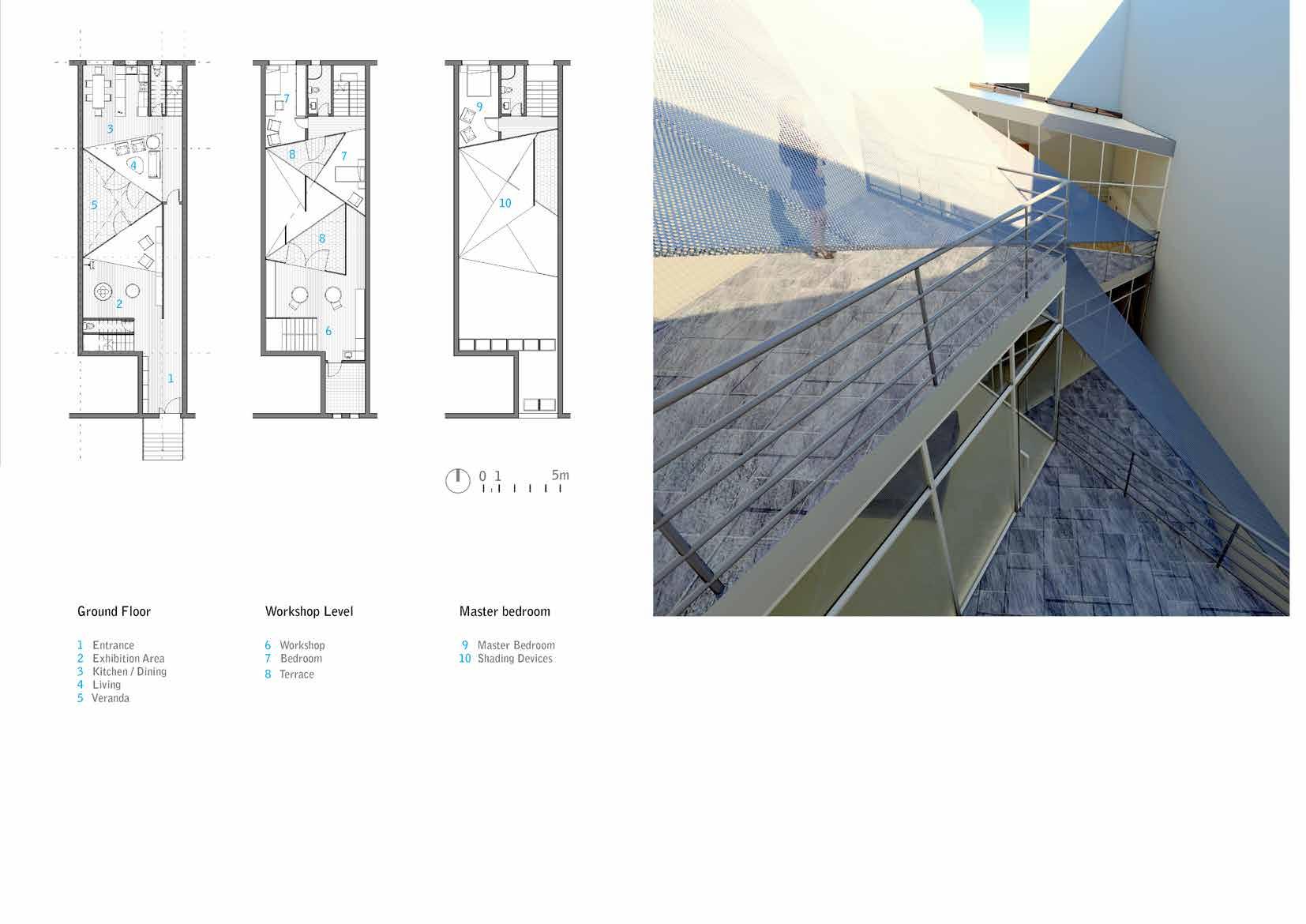 The site was first split into various grids for structural reasons. The triangular courtyard was generated by pulling two threads into triangular shape and elevating them on different heights. This gives variations in the floor plates across different levels. The courtyard also ensures the availability of natural light in the all the spaces. While maintaining privacy it gives glimpses of activity on various levels. The program is distributed such that the exhibition and workshop area are kept close to the entrance while the rest of the residential areas are placed at the further end of the house. The project was an exercise to interpret the courtyard through a new geometry generated by the threads used by the weaving artist.