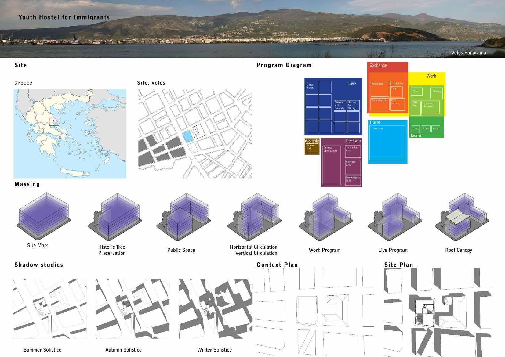 The project is a youth hostel for immigrants in Volos, Greece. The site is in the dense urban fabric of the city center, close to the old industrial area and sea access.
