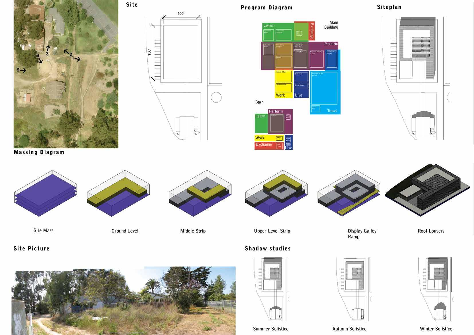 This project is a student design competition entry. The site is located in Santa Barbara, California on the West Campus of the University of California at Santa Barbara. The competition was to design the History and Nature Center for the university. It comprises of a 2700 m2 new building, an exterior plaza, and the reuse of an existing approximately 1000 m2 historic barn building.
