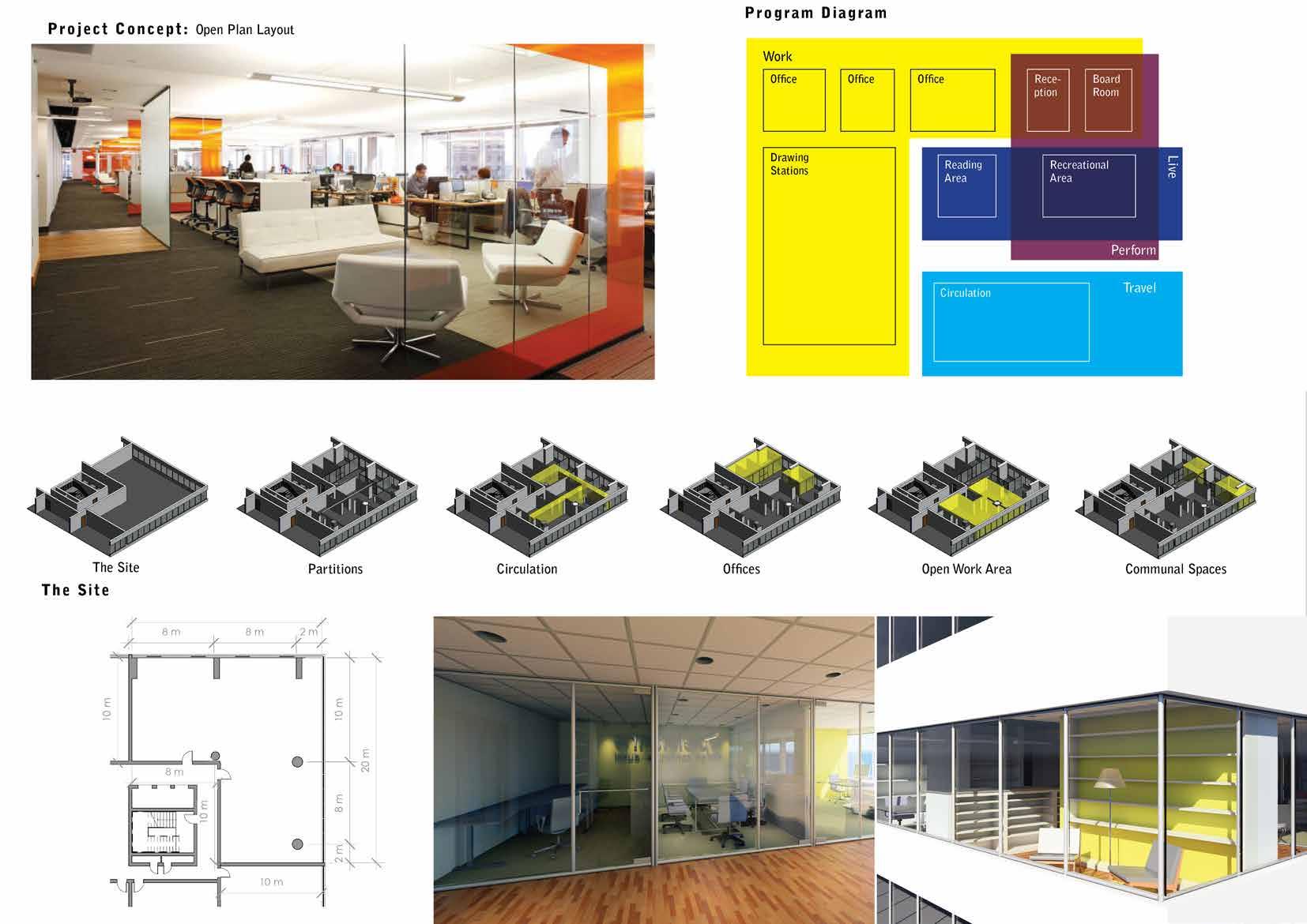 This 291 square foot project is a design studio for interior designers in an office tower in Dubai Marina. The floor space is an L shaped area with large windows on its eastern and southern sides. A simple arrangement strategy was employed: important offices and communal areas along the eastern side and work areas towards the southern side. The service zone is towards the west side. All the major zones are divided up with the efficient use of interior partitions, shelving and display places. Workstations are organized in a shared team tables format, which allow for prompt interaction and condone innovation. A partial drop ceiling retains the rustic nature of the building in the work area. The clients collaborative approach to design resulted in a highly functional space that serves the creative activities in the space.