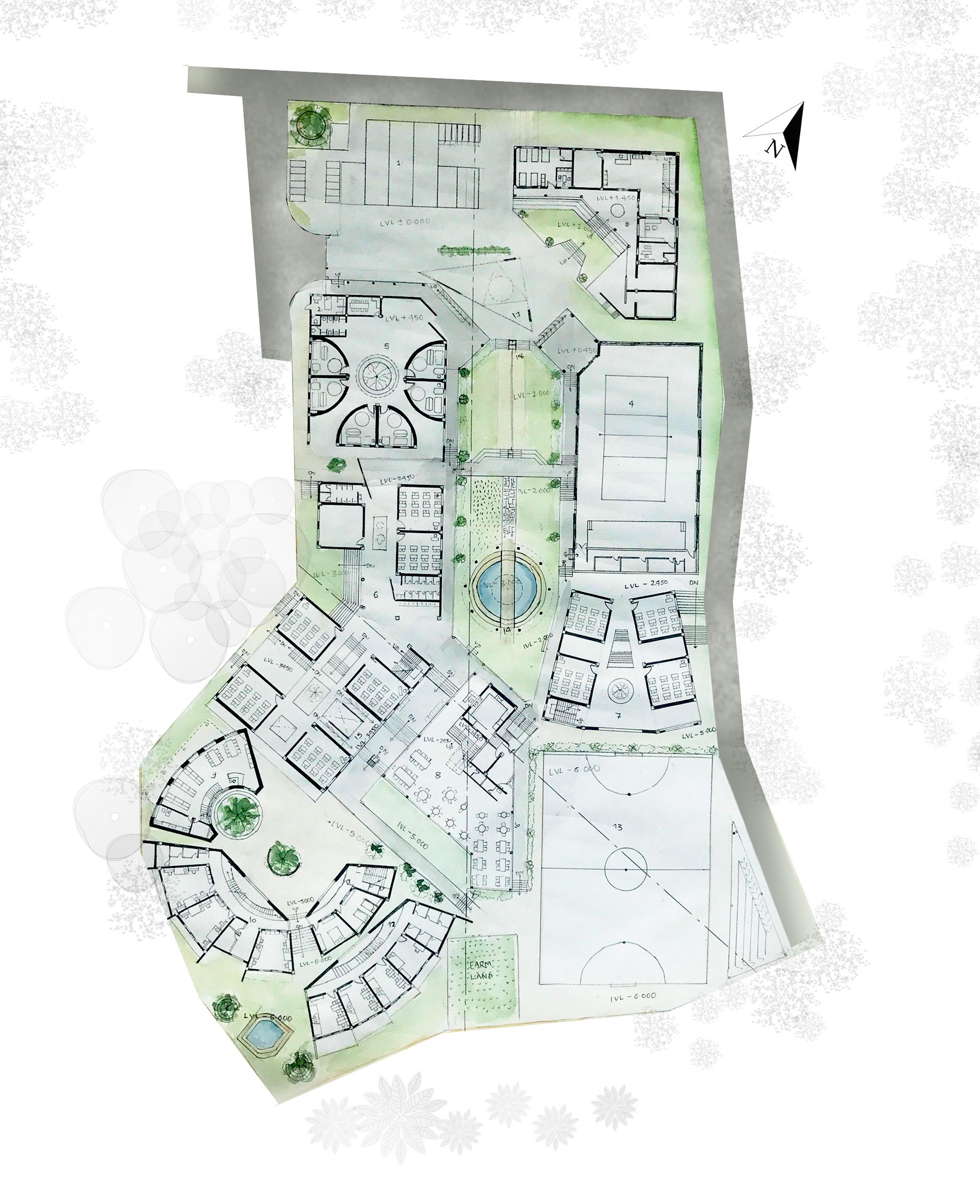 Main court area and rotunda in middle to connect all the blocks around it aswell for water harvesting