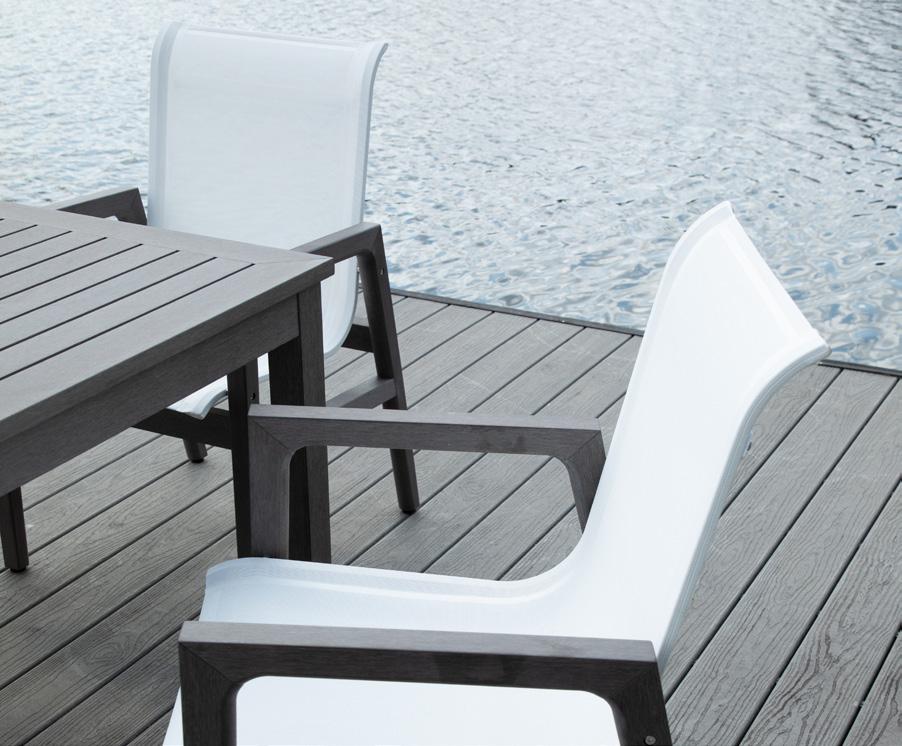 Design your lakeside haven, where elegance meets durability at its finest. N-Dura® Wood and quick-dry Batyline® performance slings merge to offer a carefree, natural look that withstands the elements. Sustainable and sturdy, these pieces are a seamless, luxurious extension of your dock or patio, promising comfort, and style through every season.