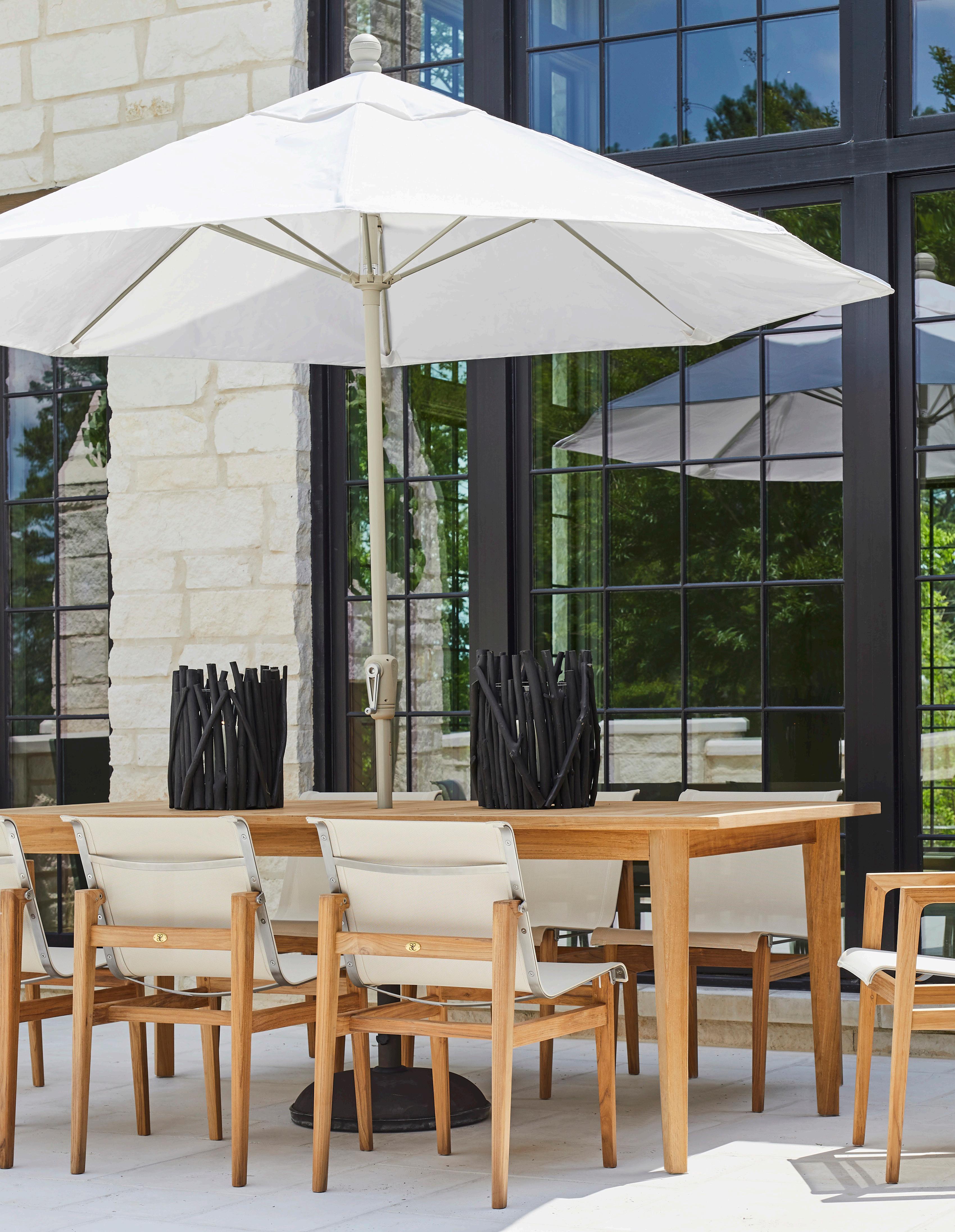 Designed for seamless integration, these umbrellas not only provide ample shade but also offer customizable options from a wide selection of fabrics, ensuring they match flawlessly with our outdoor teak dining tables. With the added convenience of ordering replacement parts, you can enjoy your meals and moments outdoors with peace of mind, truly having it made in the shade.