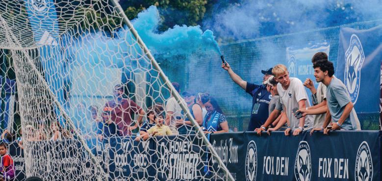 Julian Schmugge, a Mary Washington senior, is one of the Blues’ many collegiate players. Blue smoke rises from the Fox Den fan section after a goal.