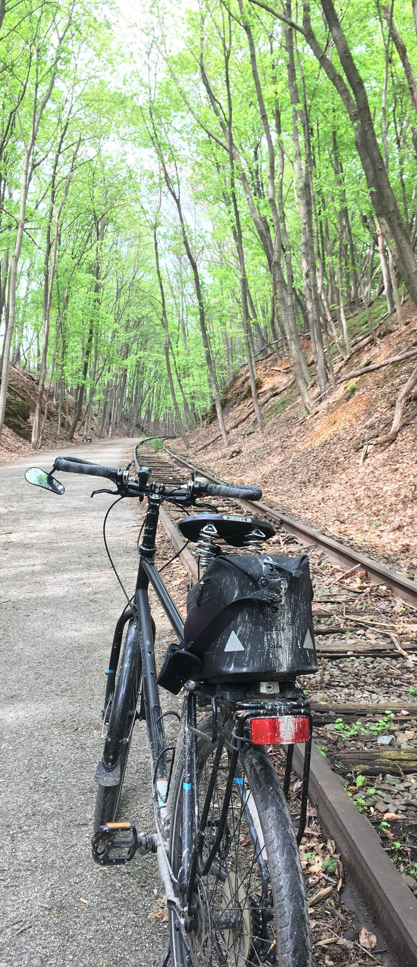 number of rail-trails. We’ve done the Great Allegheny Passage together, and the C&O canal many times, often on perfect spring days but we've also been thrashed by ugly downpours. We’ve been chased by farm dogs and buffeted by the slipstreams of semis. Through it all he has confidently rolled over ruts, pounded past puddles, mushed through mud and mire, and endured the grit and gravel in his gears, all without missing a step. This means all I ever have to do is hold onto those goofy handlebars and enjoy the scenery, unconcerned by almost anything in our path.