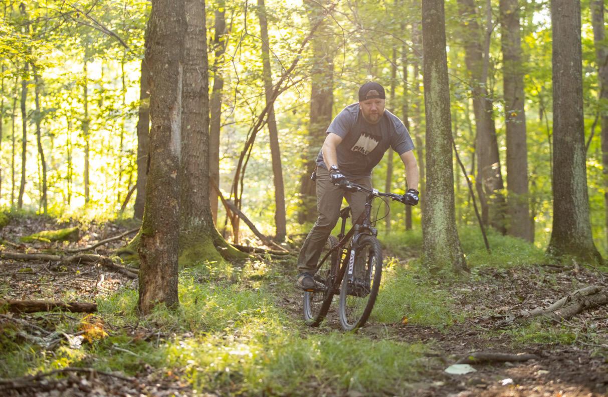 something we’d never seen before. When we were feeling found and wanting to get lost, we’d ride through Schenley Park and Squirrel Hill into Frick Park and turn on lights we had strapped to our handlebars that only showed us what was exactly, immediately, in front of us. That little halo of light became our world. The dirt singletrack our tires rolled across became our focus and we finally were just, simply, in the moment, the wildness of the immediate. The more we rode the more we realized that joy was found right in front of us and the more you found it, the more you were consumed by it. My insecurity turned into wonder in those moments of feral laughter when I could feel the city in me as our wheels and bodies arced along its terrain and we became its topography, no longer apart from but part of