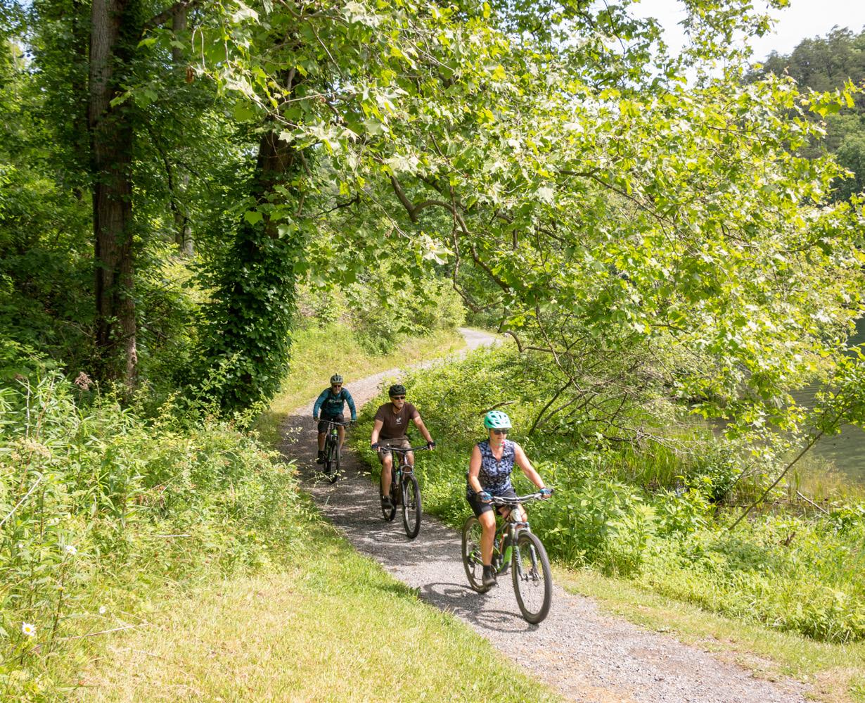 A GROUP OF BIKERS RIDE ON THE C&O CANAL TOWPATH IN ALLEGANY COUNTY, MARYLAND. PHOTO COURTESY OF ALLEGANY COUNTY, MD