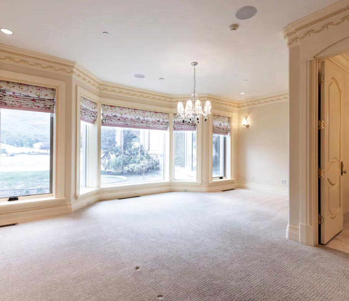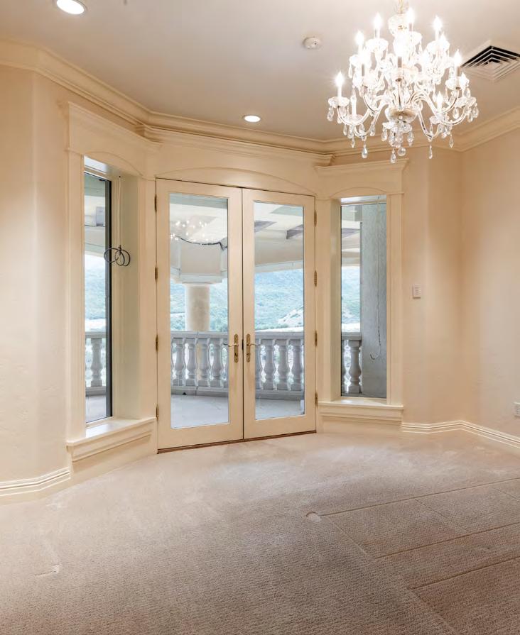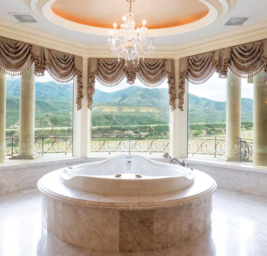 Some might say they have seen apartments smaller than this primary suite. The windows on the western wall frame in the view of the Wasatch Mountains, while French doors open out to the deck. There is a stone fireplace on the southern wall with room for lounge seating, three chandeliers, and a relatively blank canvas ready for your personal touch. The spa-like bathroom is equally impressive with marble floors, dual vanities, a spacious shower with multiple heads and a gorgeous jetted tub perfectly positioned to enjoy the amazing views. The closet was designed to spare no expense and abuts a private spiral staircase that leads down to the swimming pool.