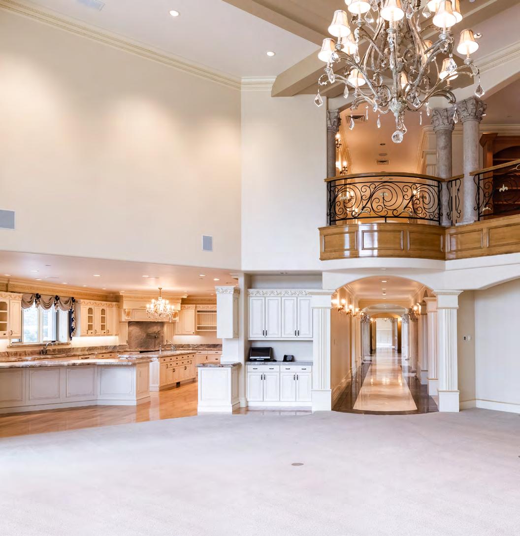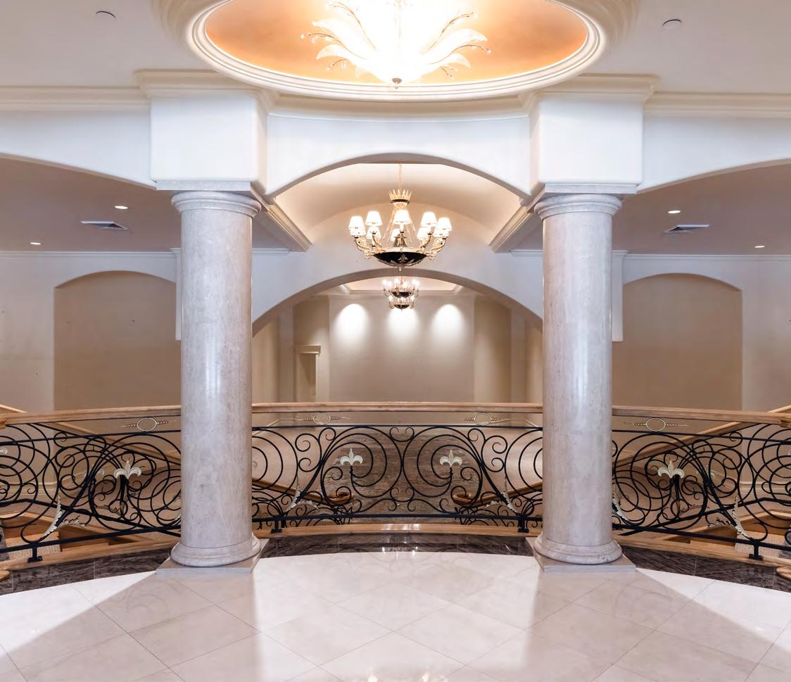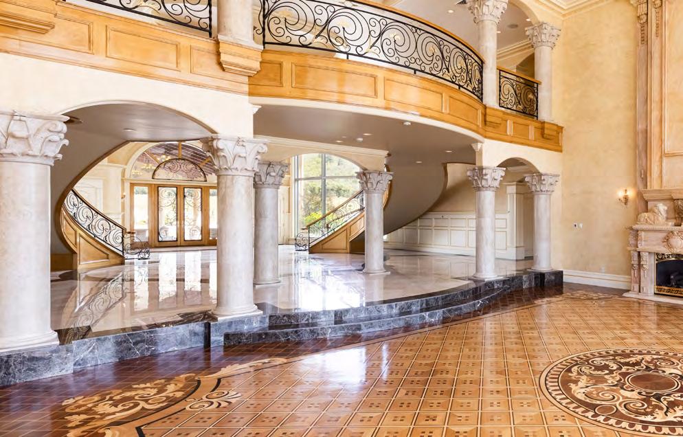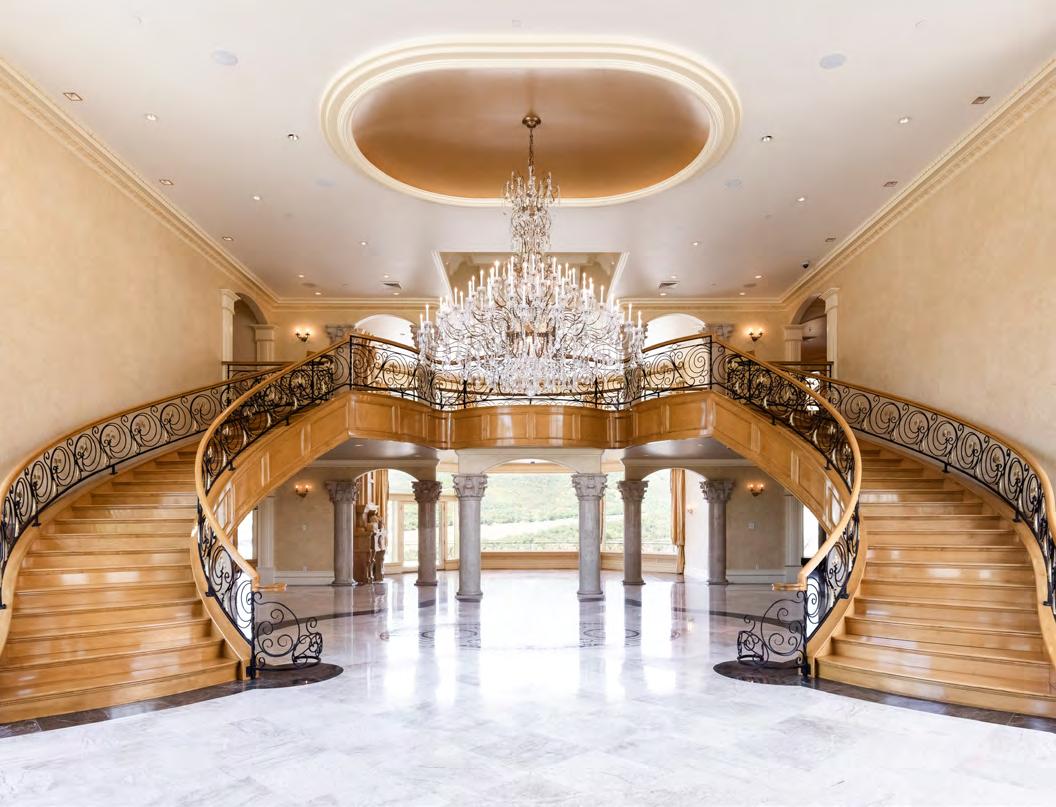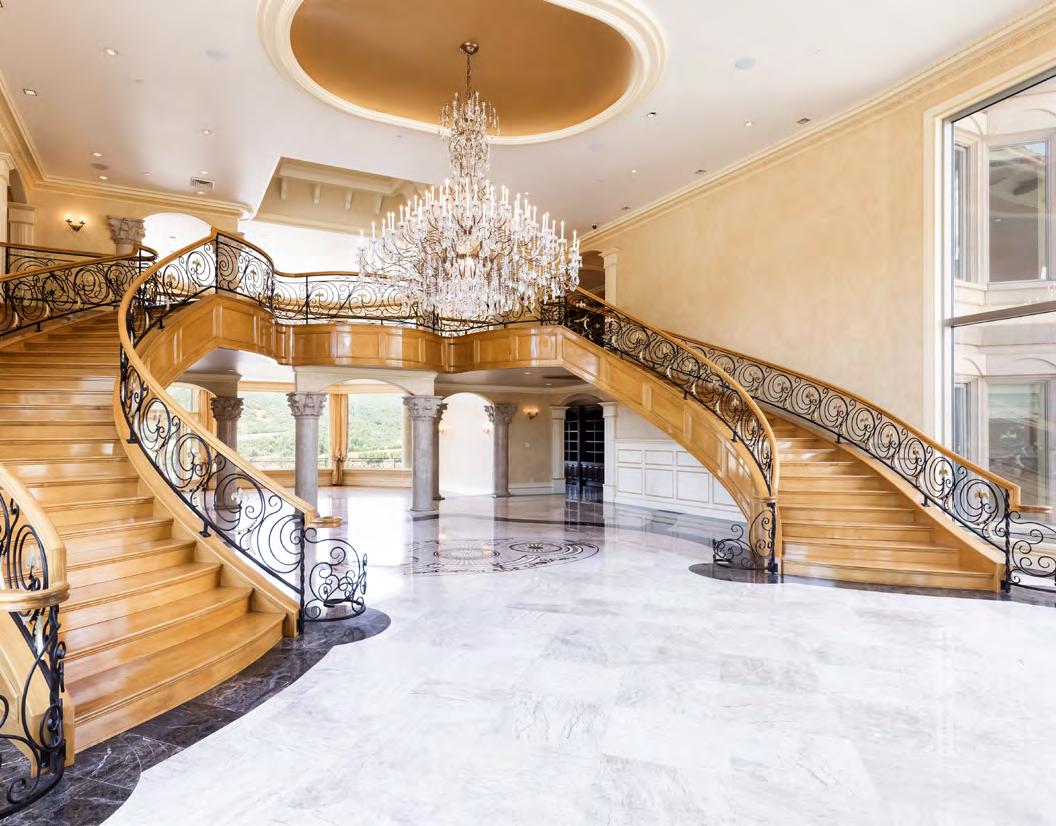 The grand entry is as dramatic as the views. As you enter the home you are greeted with smooth marble floors, a 22’ high ceiling, a massive chandelier, and twin curved staircases with ornate metal balustrades. It is an astonishing entry meant to impress. If you walk forward under the chandelier and then turn back toward the front door you will see a large coat closet on the right and a half bathroom on the left.