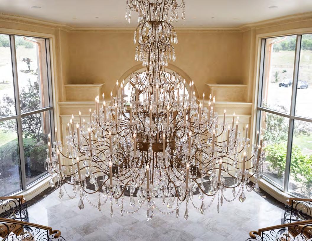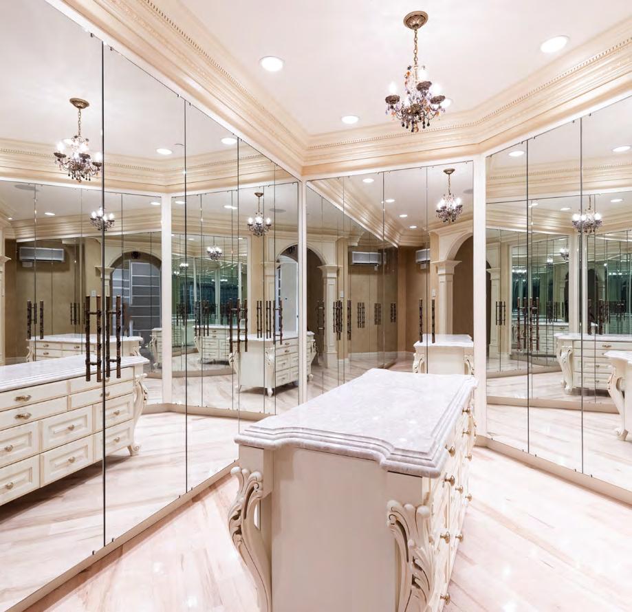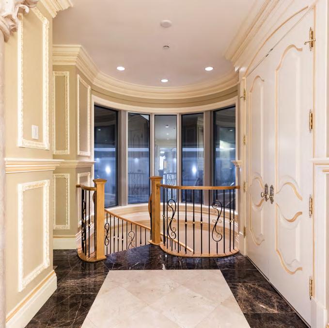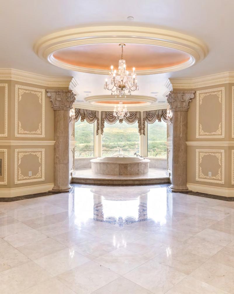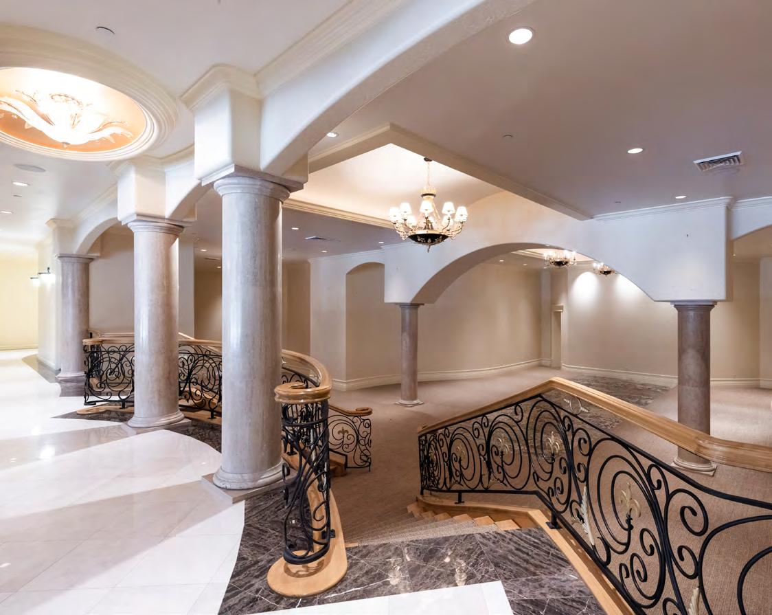 The grand entry is as dramatic as the views. As you enter the home you are greeted with smooth marble floors, a 22’ high ceiling, a massive chandelier, and twin curved staircases with ornate metal balustrades. It is an astonishing entry meant to impress. If you walk forward under the chandelier and then turn back toward the front door you will see a large coat closet on the right and a half bathroom on the left.