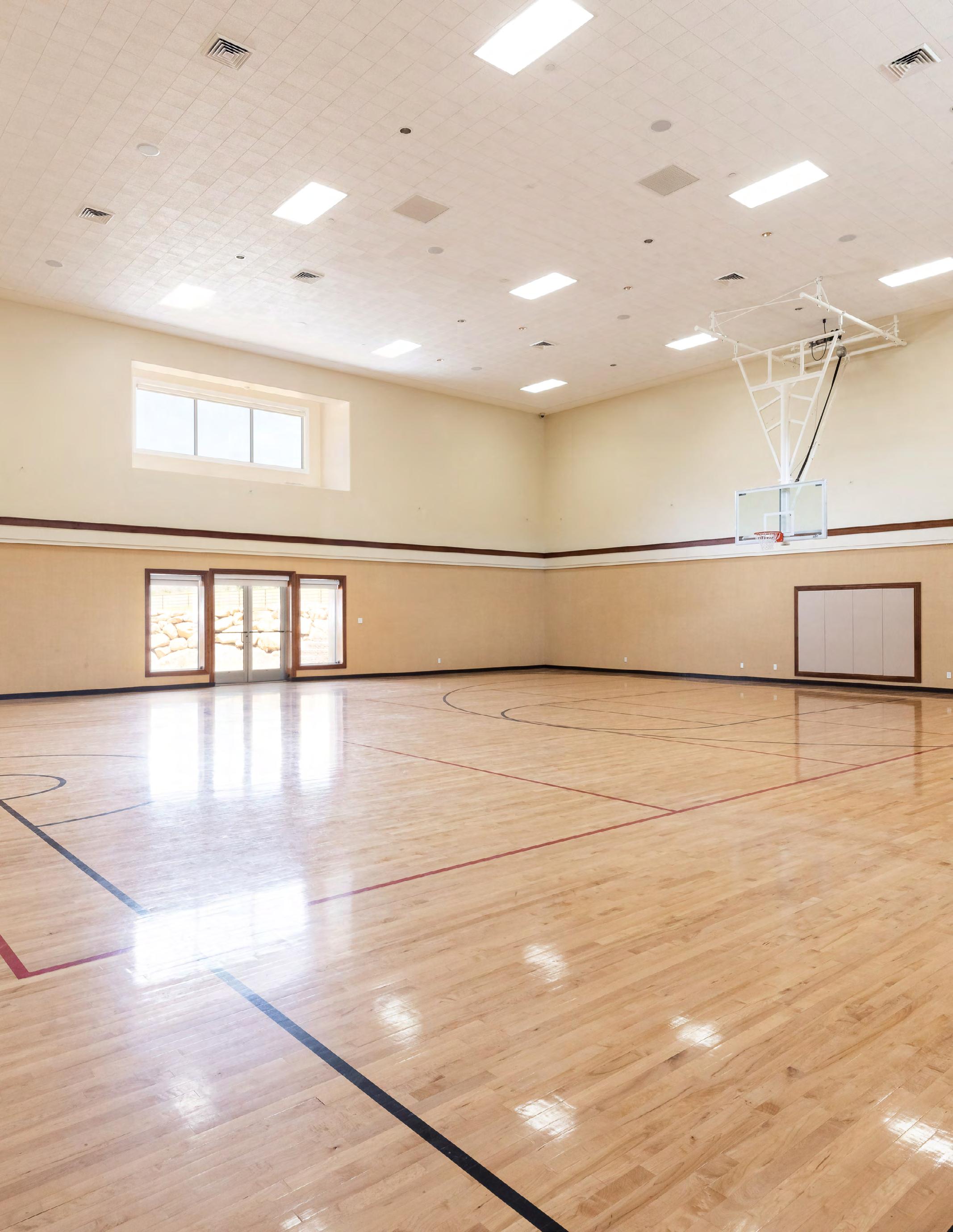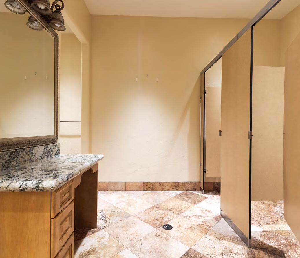 In the hallway before you enter the swimming pool, there are men’s and women’s changing rooms. Each one contains two changing stalls, a toilet room, and two showers. There are also two half bathrooms in the walkway between the swimming pool and the basketball court.