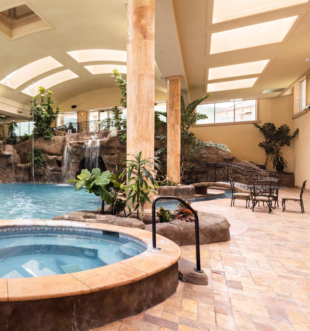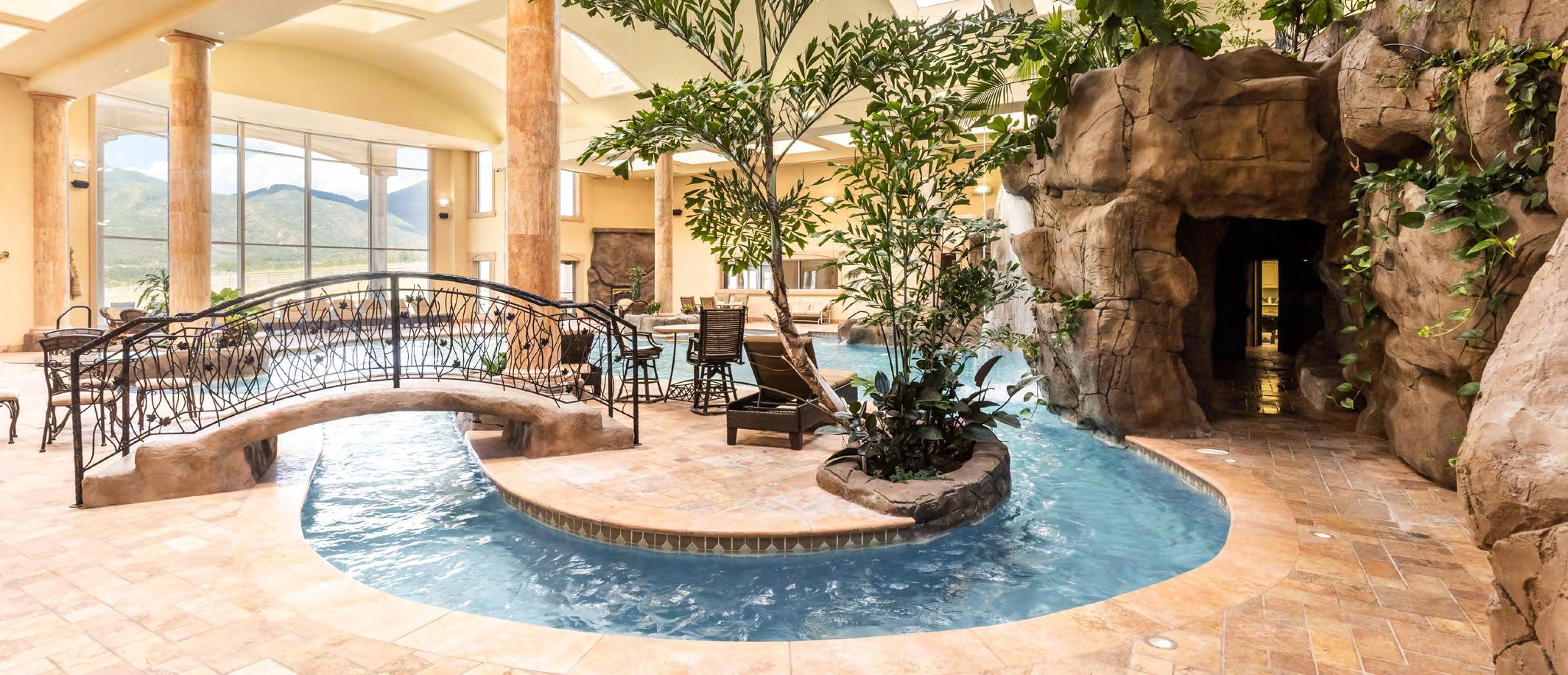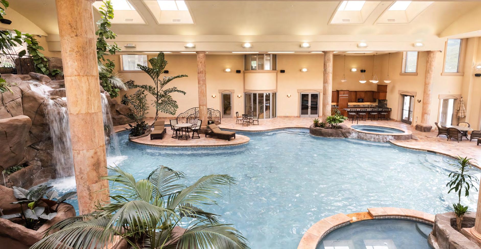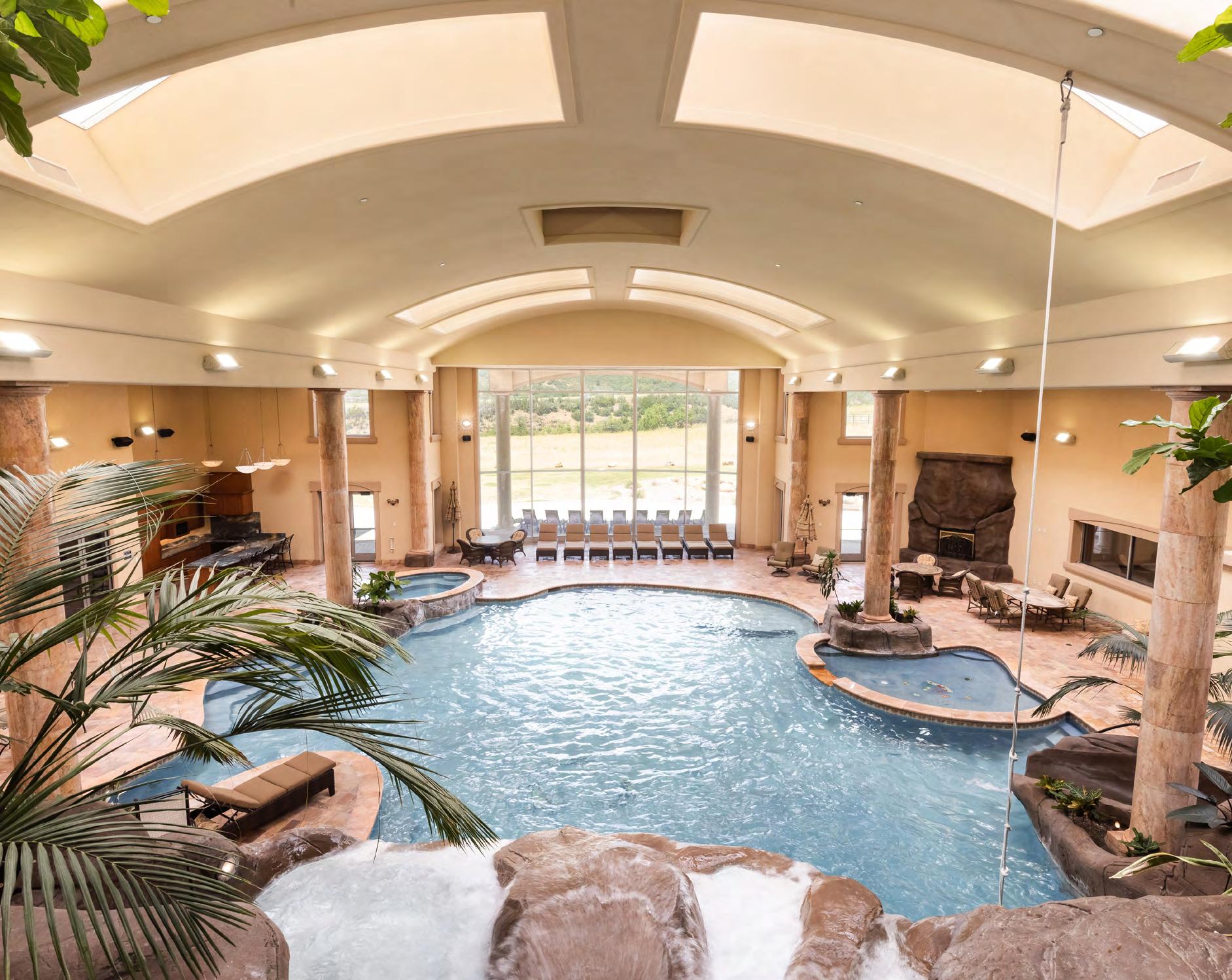 If you allowed 100 people to tour the property and then took a survey at the end and asked them what was the most memorable part of the home, the swimming pool would win almost every time. Reminiscent of a luxury resort, nothing was spared when they designed and built this memorable space. When you stand on the edge of the pool and look up your eyes immediately go to the waterfall pouring down from a man-made stone cliff and dropping eleven feet into the pool. To the left of the waterfall there are platforms where you can jump, dive, or swing out on a rope swing. Next to that is a waterslide that shoots you out into the water. There is a lazy river, a hot tub, a shallow children’s pool, and lots of open water where everyone can enjoy hours of fun. If you can pull your eyes away from the pool, there is a massive wall of windows that not only brings in natural light, but it offers some of the best views of the mountains. When you need a rest, there are plenty of sitting areas on the pool deck along with a full kitchen where you can prepare and serve food to all of the hungry swimmers.