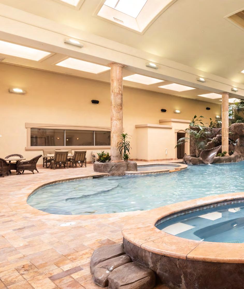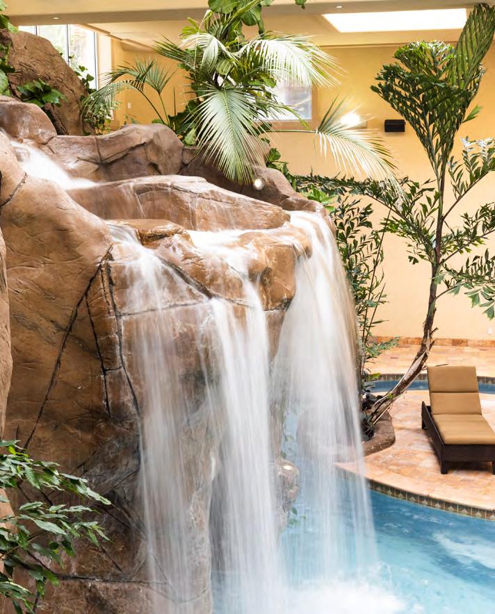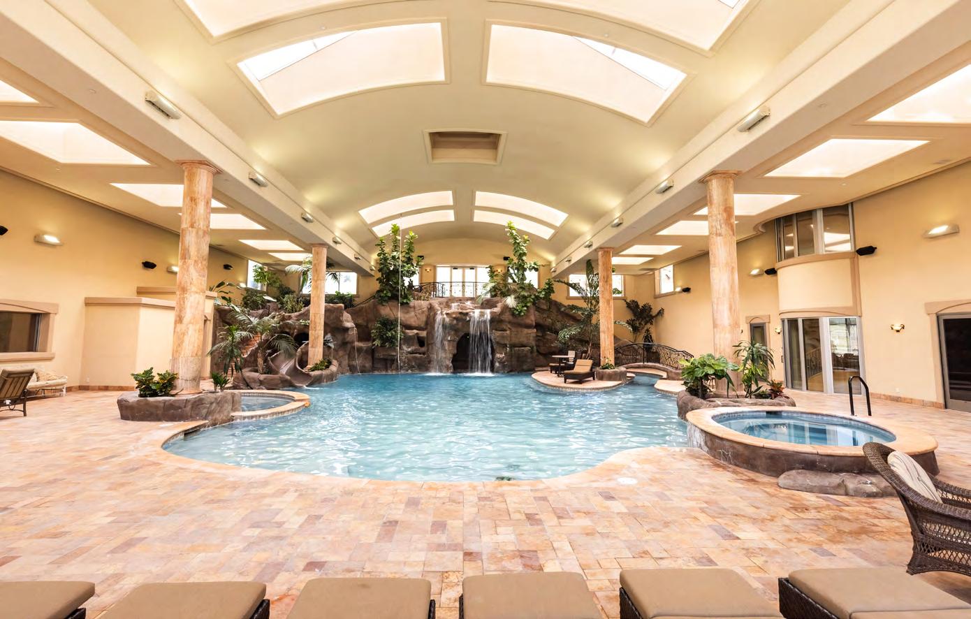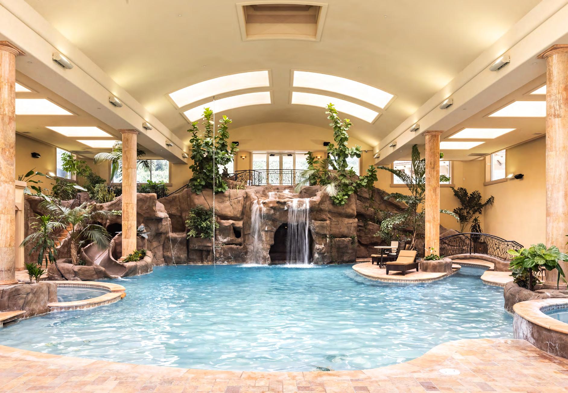 If you allowed 100 people to tour the property and then took a survey at the end and asked them what was the most memorable part of the home, the swimming pool would win almost every time. Reminiscent of a luxury resort, nothing was spared when they designed and built this memorable space. When you stand on the edge of the pool and look up your eyes immediately go to the waterfall pouring down from a man-made stone cliff and dropping eleven feet into the pool. To the left of the waterfall there are platforms where you can jump, dive, or swing out on a rope swing. Next to that is a waterslide that shoots you out into the water. There is a lazy river, a hot tub, a shallow children’s pool, and lots of open water where everyone can enjoy hours of fun. If you can pull your eyes away from the pool, there is a massive wall of windows that not only brings in natural light, but it offers some of the best views of the mountains. When you need a rest, there are plenty of sitting areas on the pool deck along with a full kitchen where you can prepare and serve food to all of the hungry swimmers.