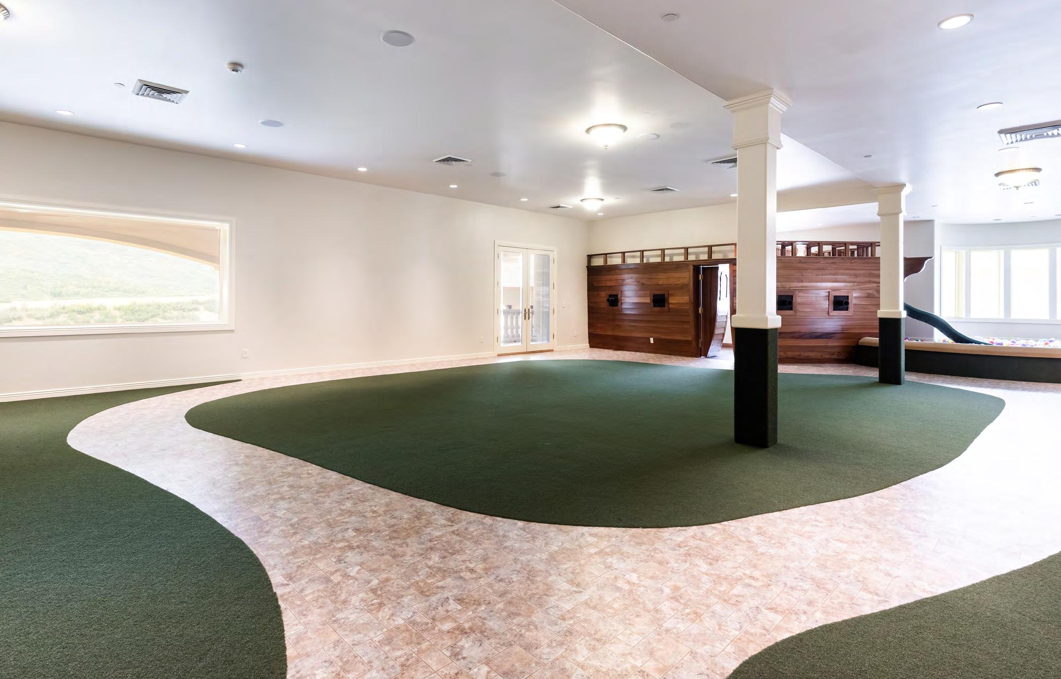 On the north end of the second level there is an amazing playroom. The highlight of the space is a pirate ship play structure with a slide that ends in a pool full of plastic balls. There is even a bathroom inside the pirate ship! With a drinking fountain on the wall, turf flooring, a private balcony, and a pretend kitchen with wood cabinets and granite countertops, children of all ages will absolutely love this room.