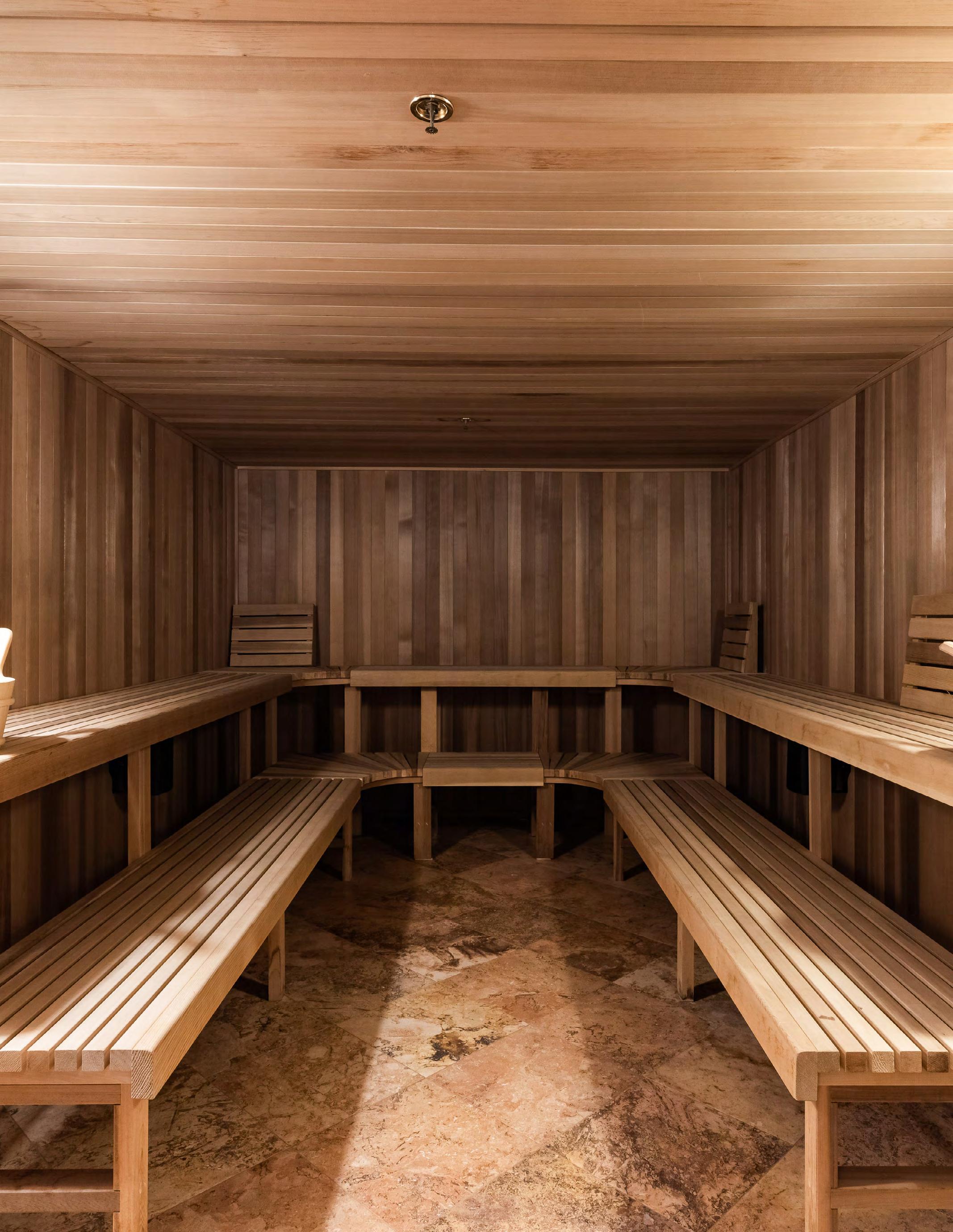 The exercise room is located near the swimming pool area. It is 34’x25’ and contains a sizeable dry sauna as well as French doors that open out to the back patio.