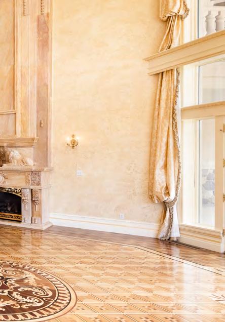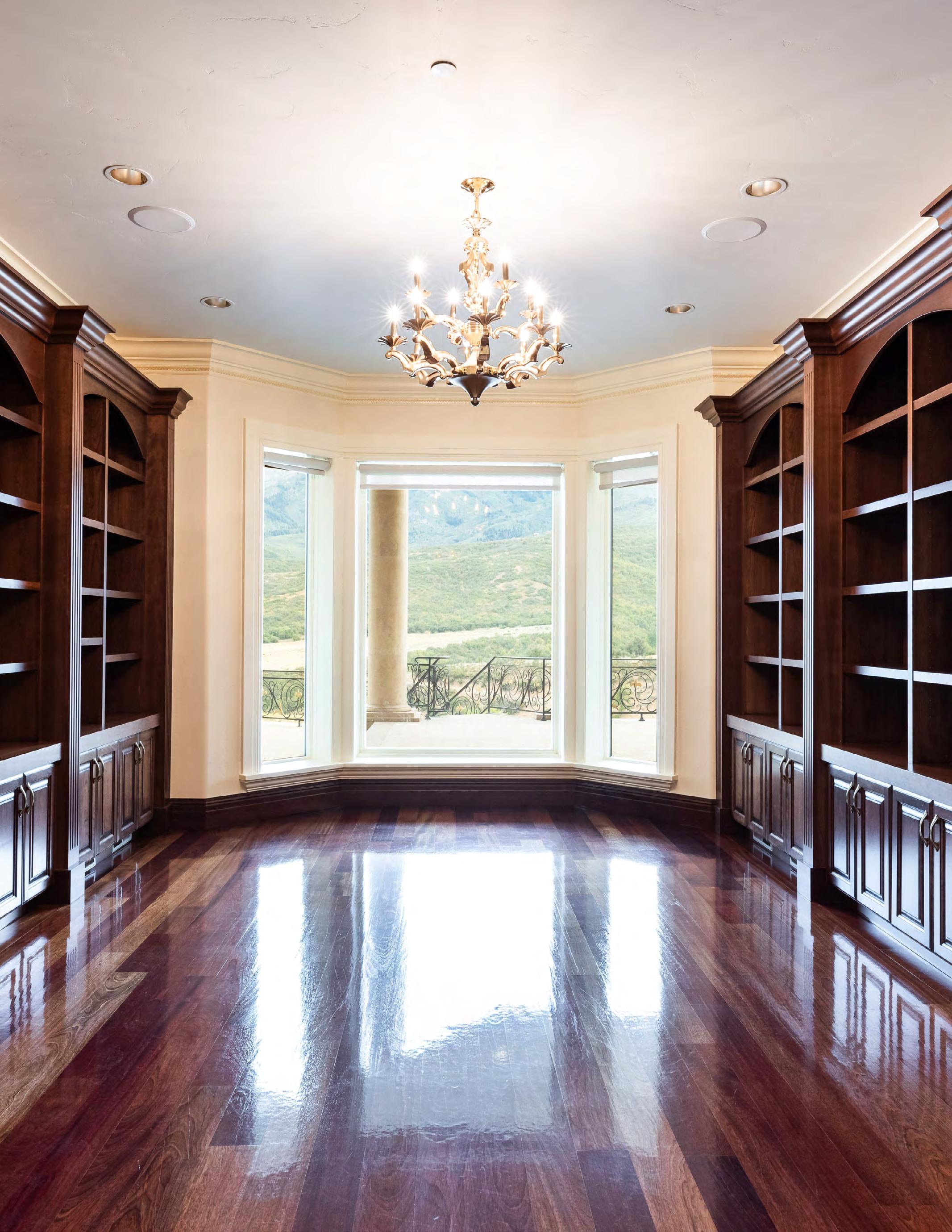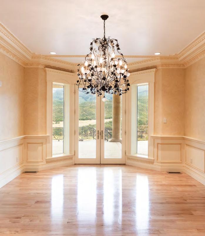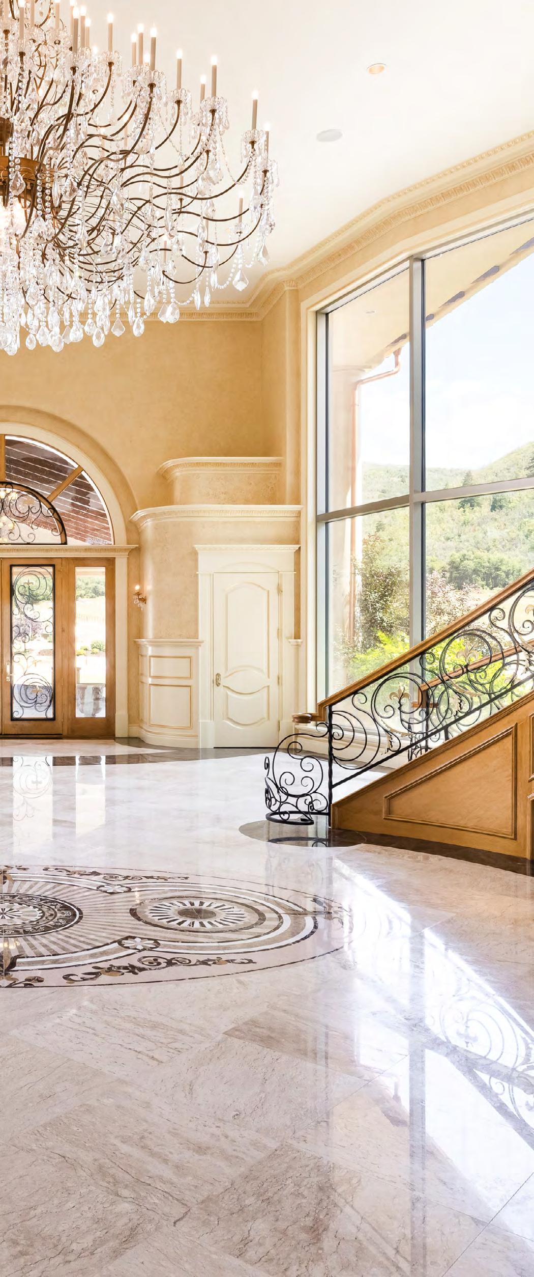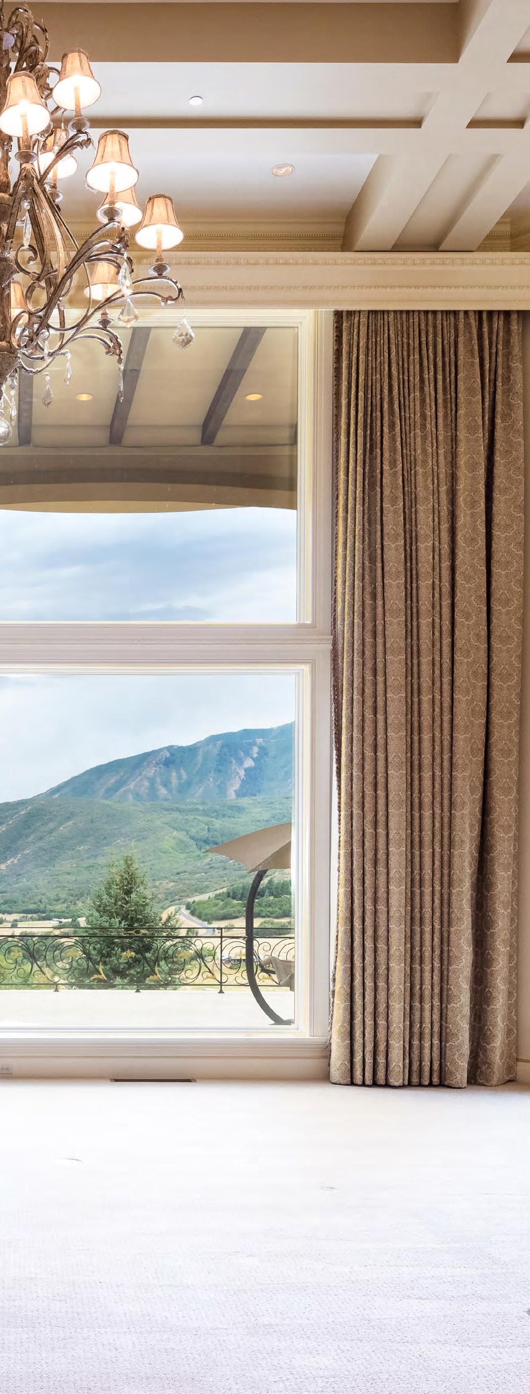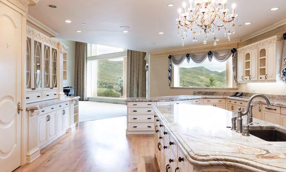 Just beyond the grand entry is a stunning reception room with 23’ high ceilings and a wall of windows that span the entire length and height of the room, framing the mountain range. With a stone carved fireplace that cascades up the southern wall and French doors that open out to a massive deck, this room is ideal for entertaining. The detailed floors showcase beautiful craftsmanship with intricate wood design reminiscent of a Russian cathedral.