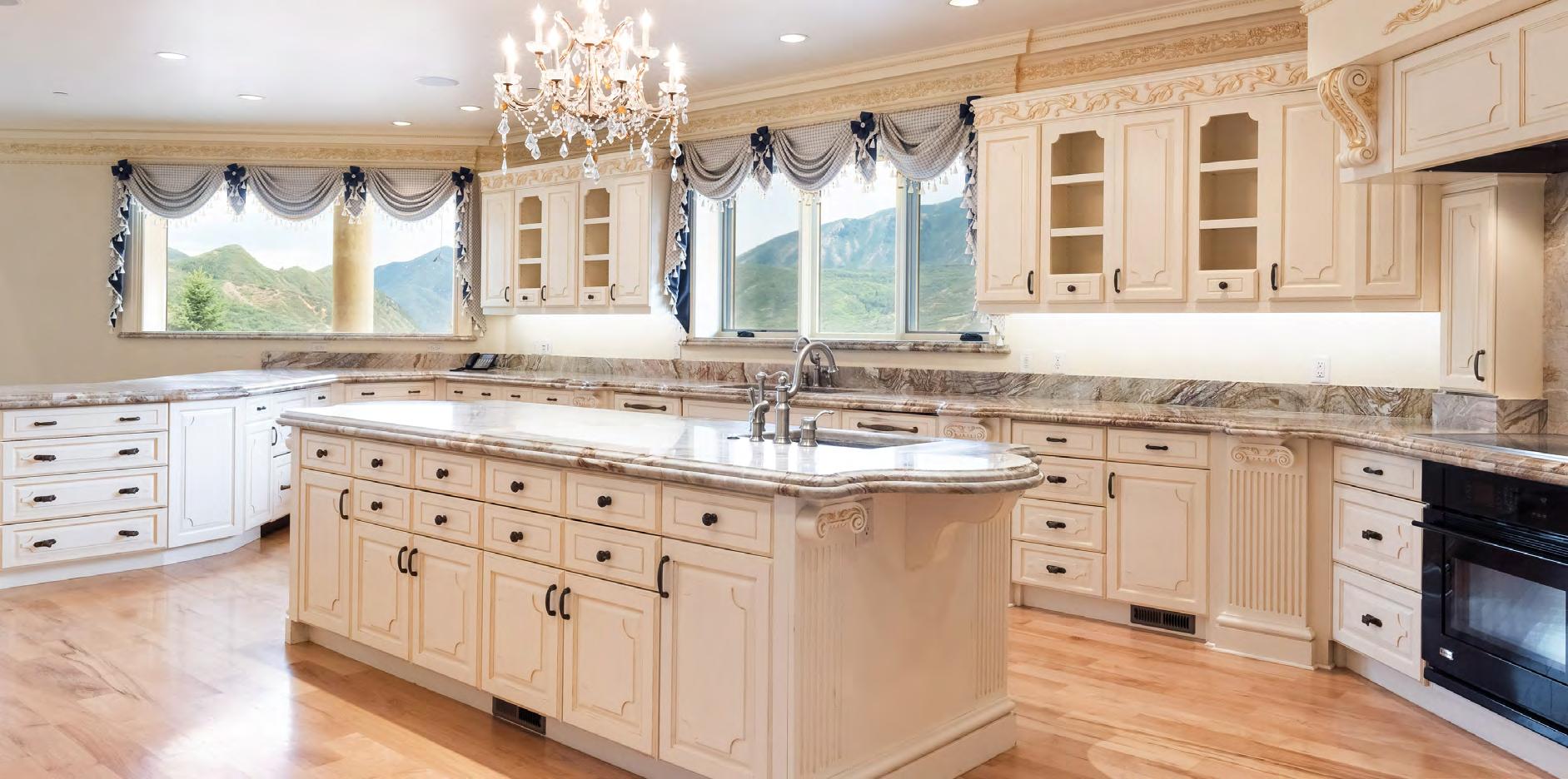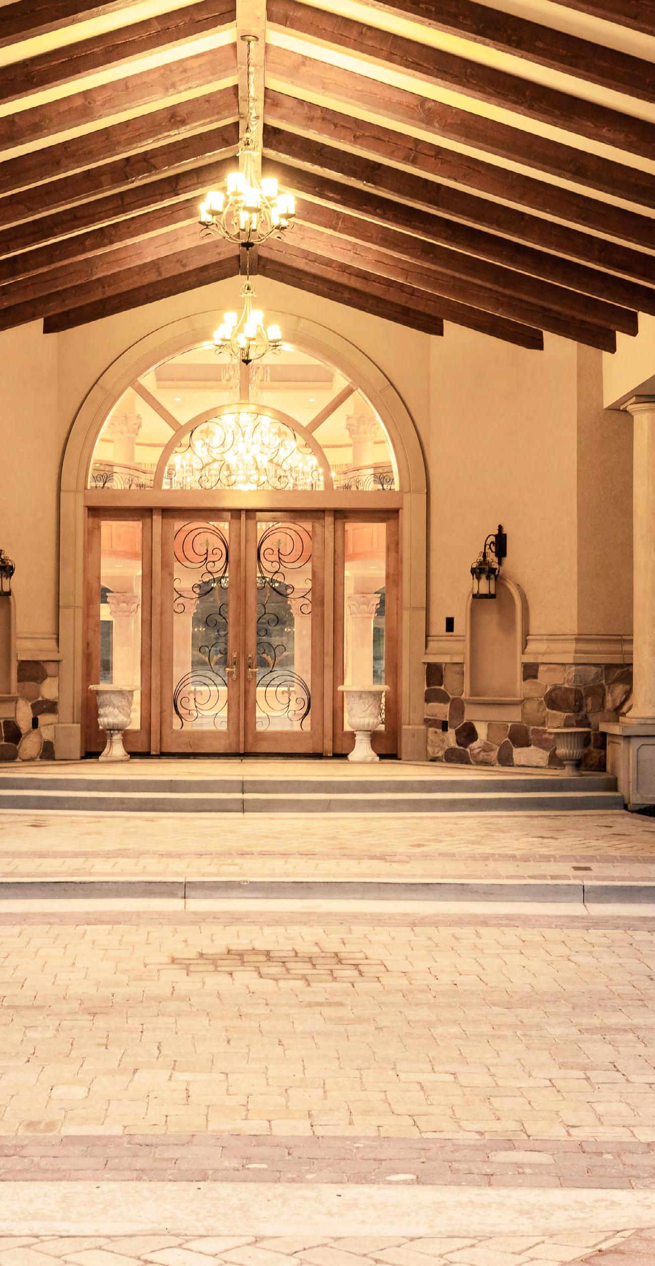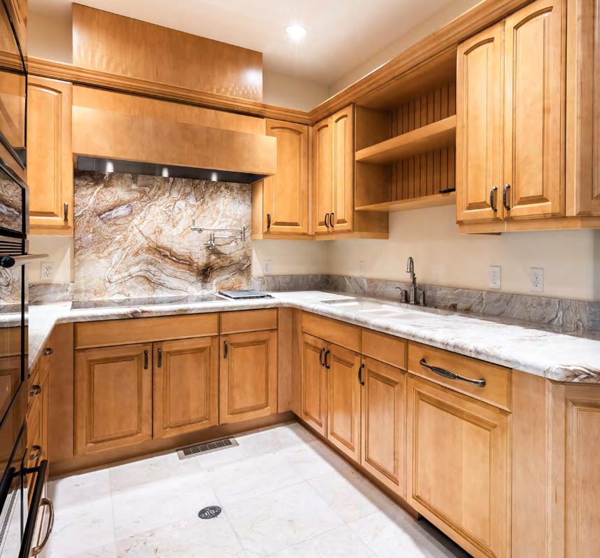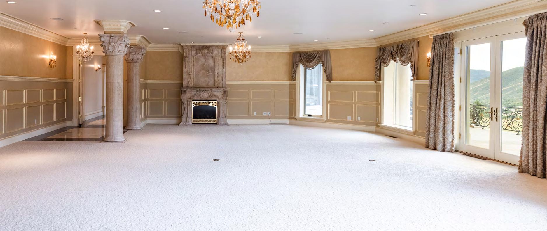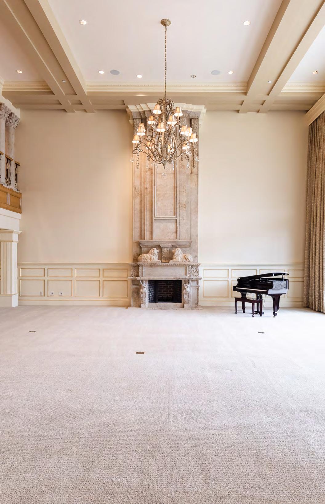 Just beyond the grand entry is a stunning reception room with 23’ high ceilings and a wall of windows that span the entire length and height of the room, framing the mountain range. With a stone carved fireplace that cascades up the southern wall and French doors that open out to a massive deck, this room is ideal for entertaining. The detailed floors showcase beautiful craftsmanship with intricate wood design reminiscent of a Russian cathedral.