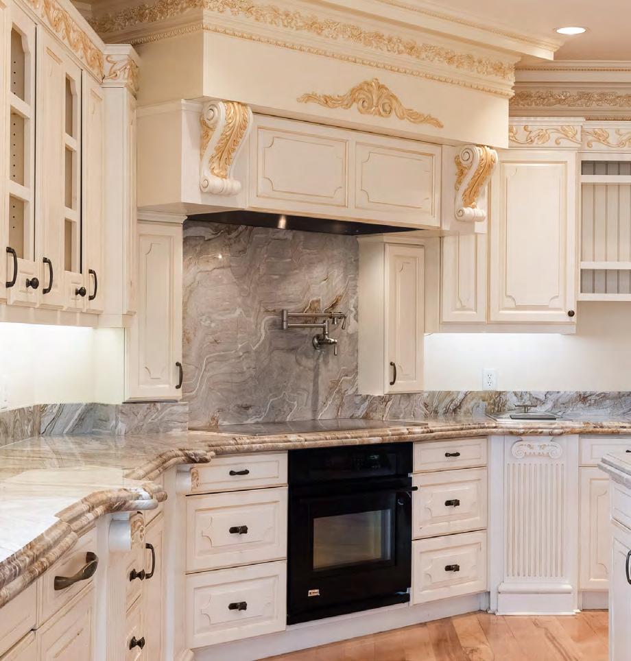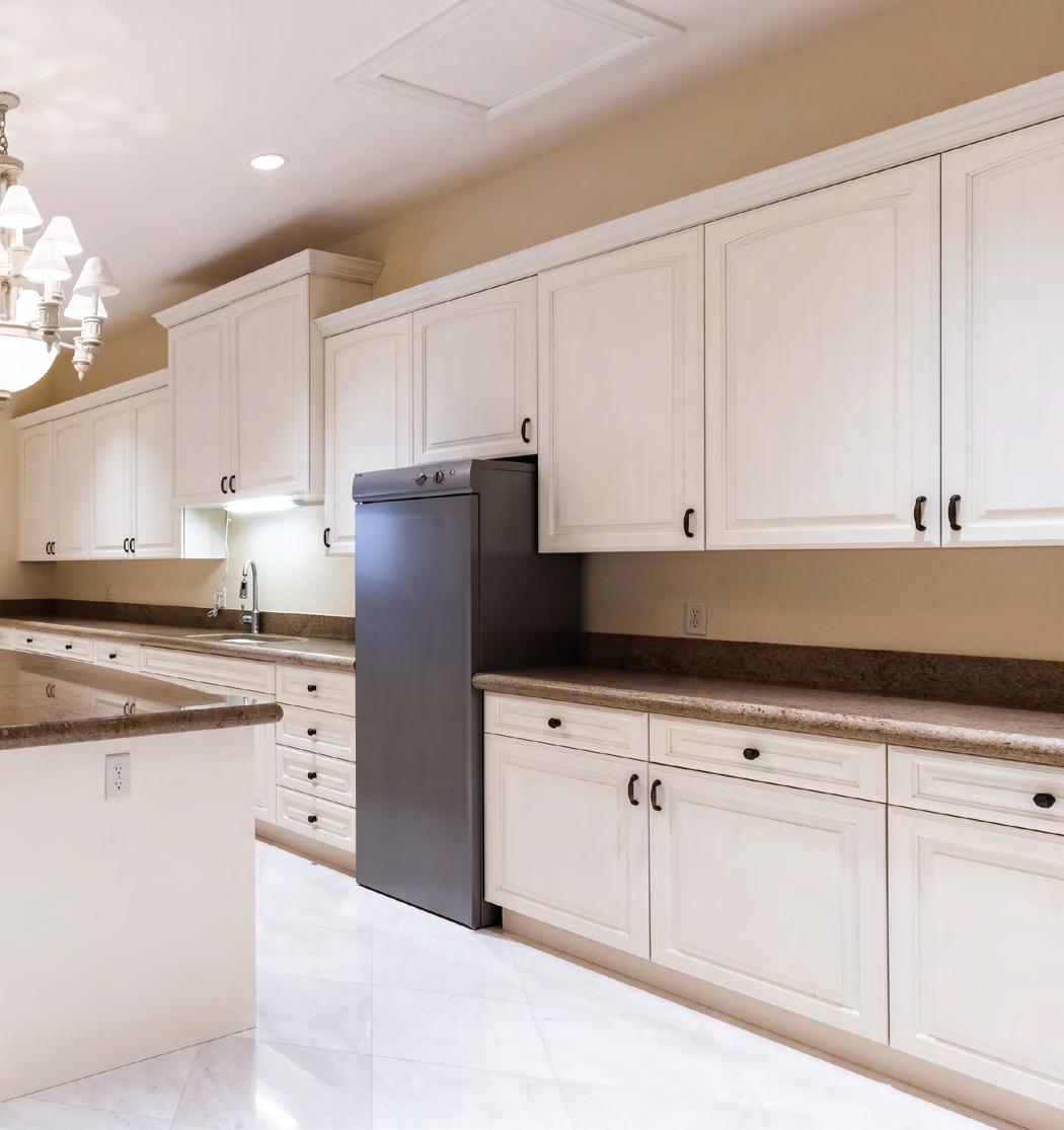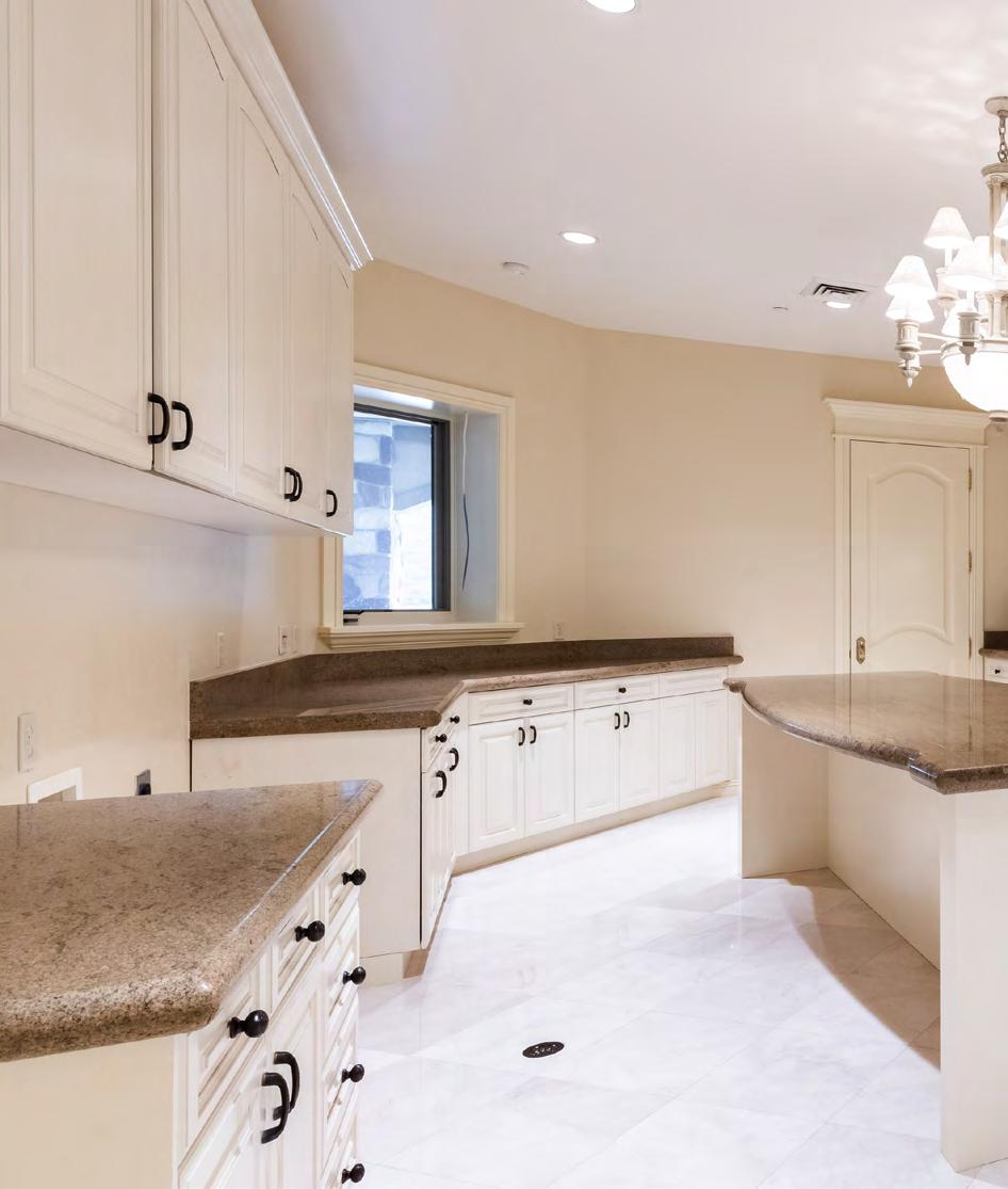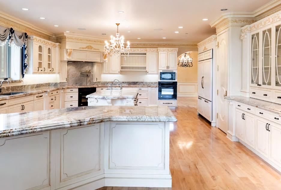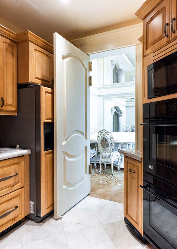 As you might expect, the kitchen is big. There are light hardwood floors, a large island, white cabinets with detailed crown molding, and marble countertops. There is a huge pantry hidden behind the built-in display cabinet. Appliances include an electric range top, two ovens, two dishwashers, a countertop warmer, microwave, and a large fridge/freezer.
