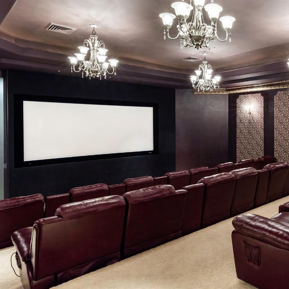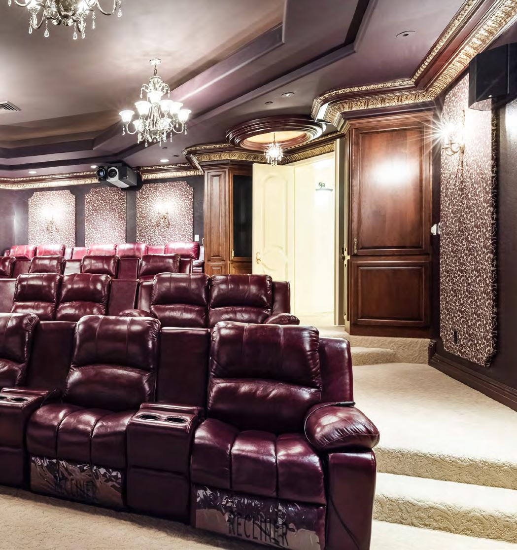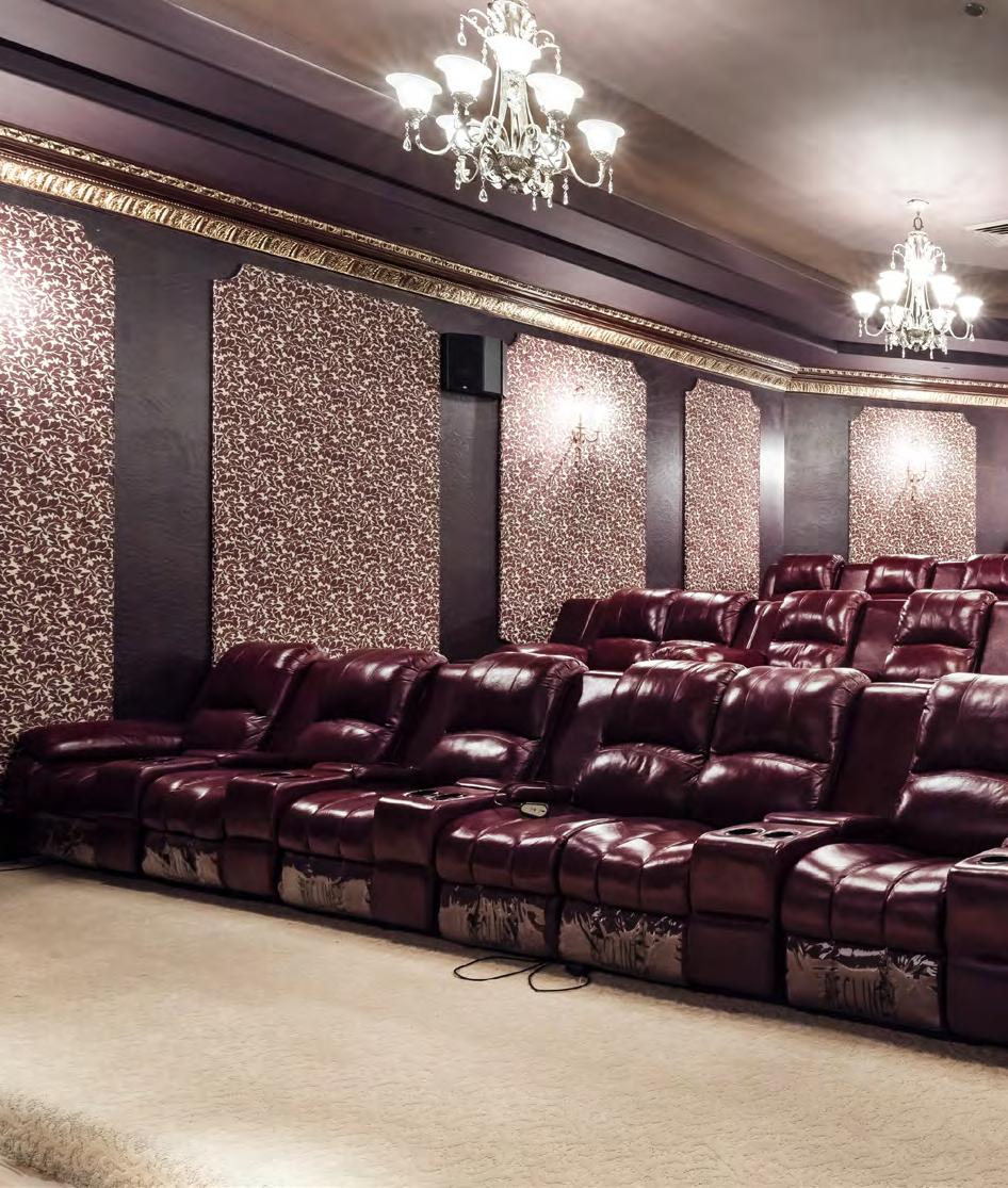 The theater room has twenty-seven leather reclining chairs on four different levels. The flooring is lush carpet, the walls are padded to help contain the sound, there are four chandeliers, and there is an equipment room located behind the screen.