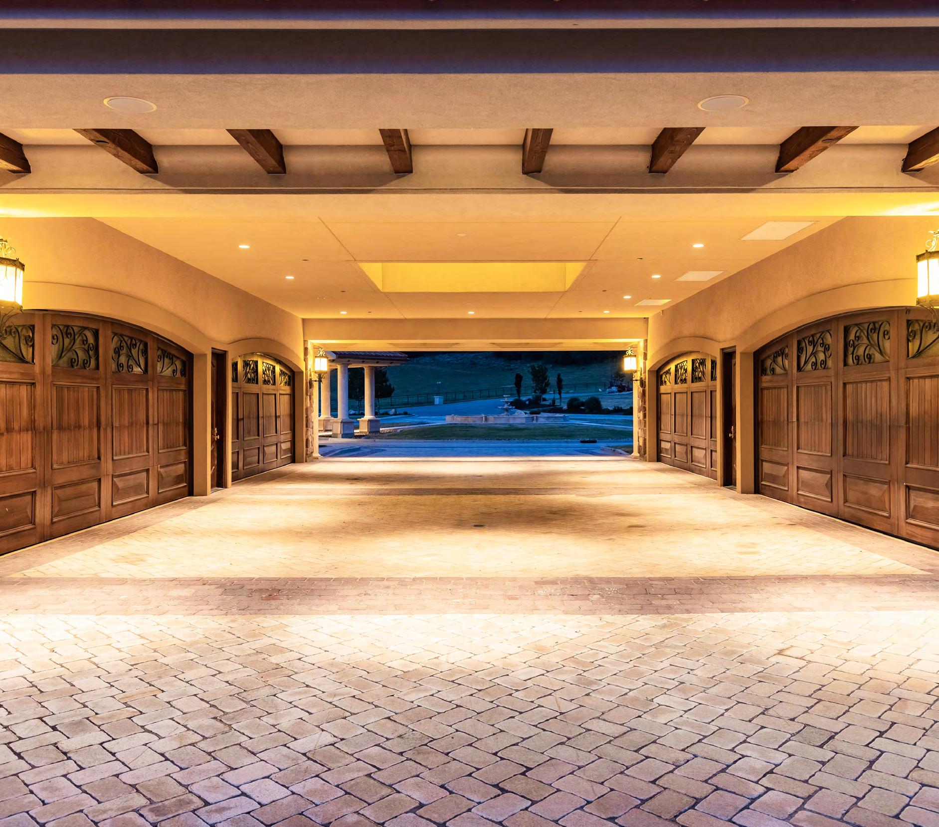 Once you reach the end of the asphalt on the private lane, the driveway in front of the home turns to paver stones. Under these pavers there is a radiant heating system for snow melting. The equipment and large boilers are housed in a room in the east garage. The driveway ultimately leads to a covered area where there are two garage doors on the east side for four vehicles and two garage doors on the west side for another four vehicles. There is also a workshop with a garage space ideal for parking yard and snow removing equipment. In addition to the garages, there are numerous outside parking areas for guests.
