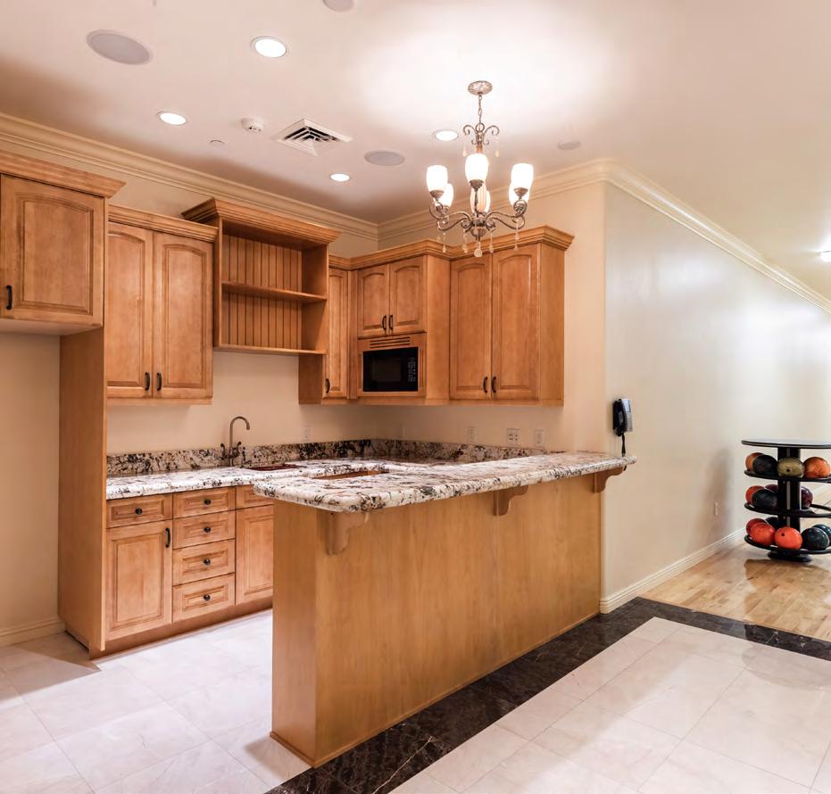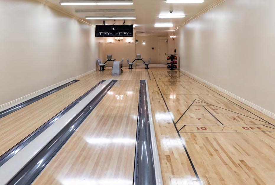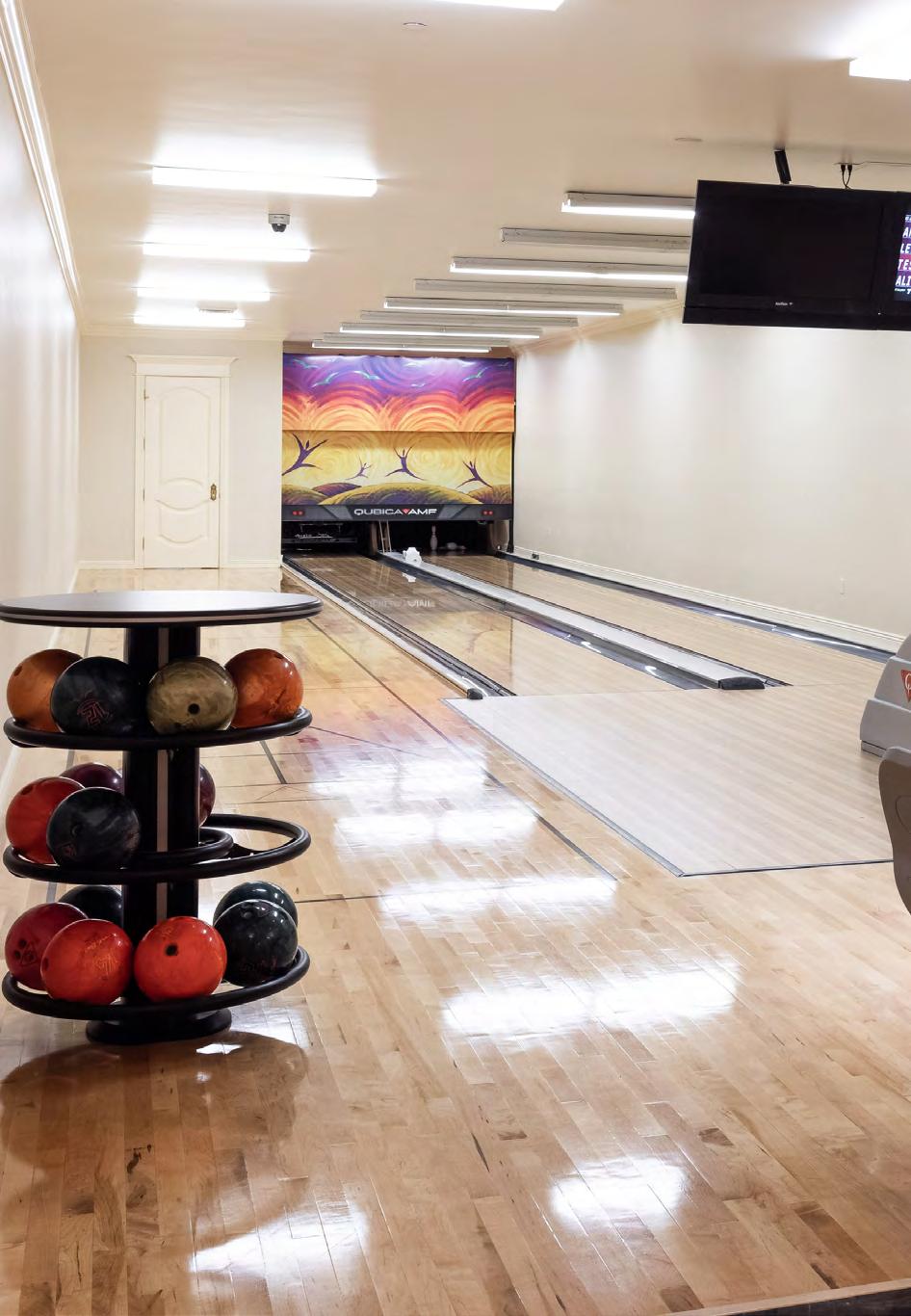 Who doesn’t love to bowl? The two-lane bowling alley with its sitting area and electronic scoreboard is a favorite for all ages. There is even a wet bar for serving snacks and a half bathroom.