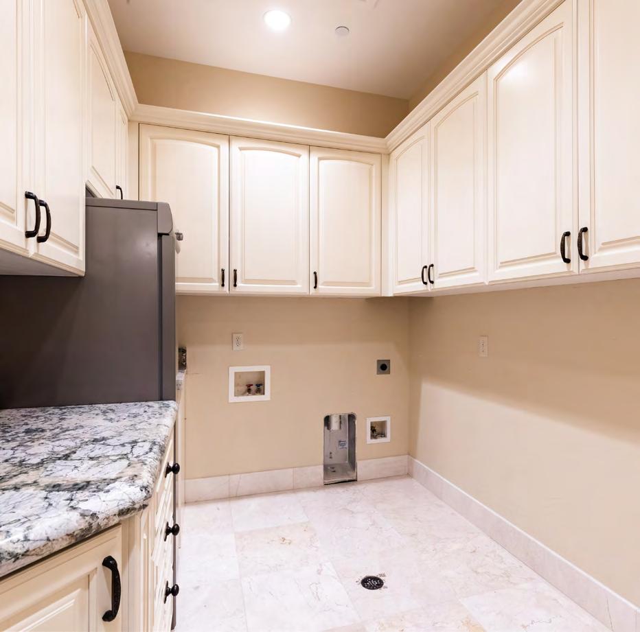 There are four laundry facilities in the home. One is by the garage entrance, one in the primary suite, one on the second level, and the largest one is in the basement close to the exercise room and swimming pool area.