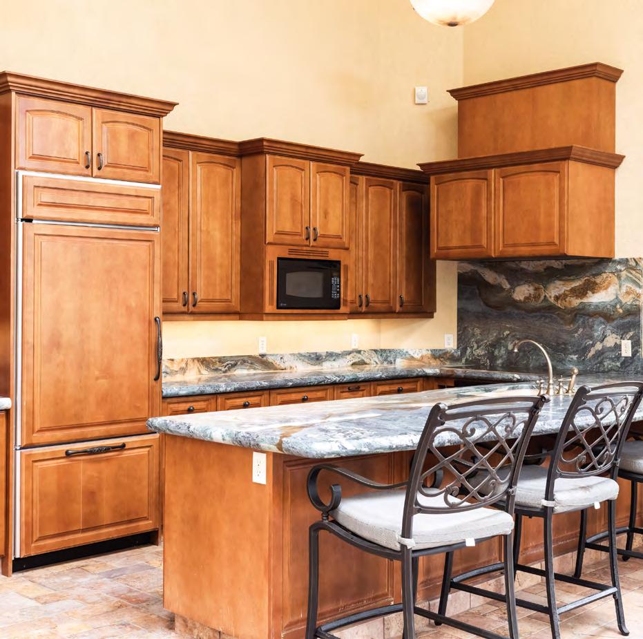 Just outside of the theater room there is a family room with a stone fireplace, a game area, and French doors that open to the backyard patio. There is also a kitchen with a refrigerator/freezer, range, oven, microwave, and dishwasher.