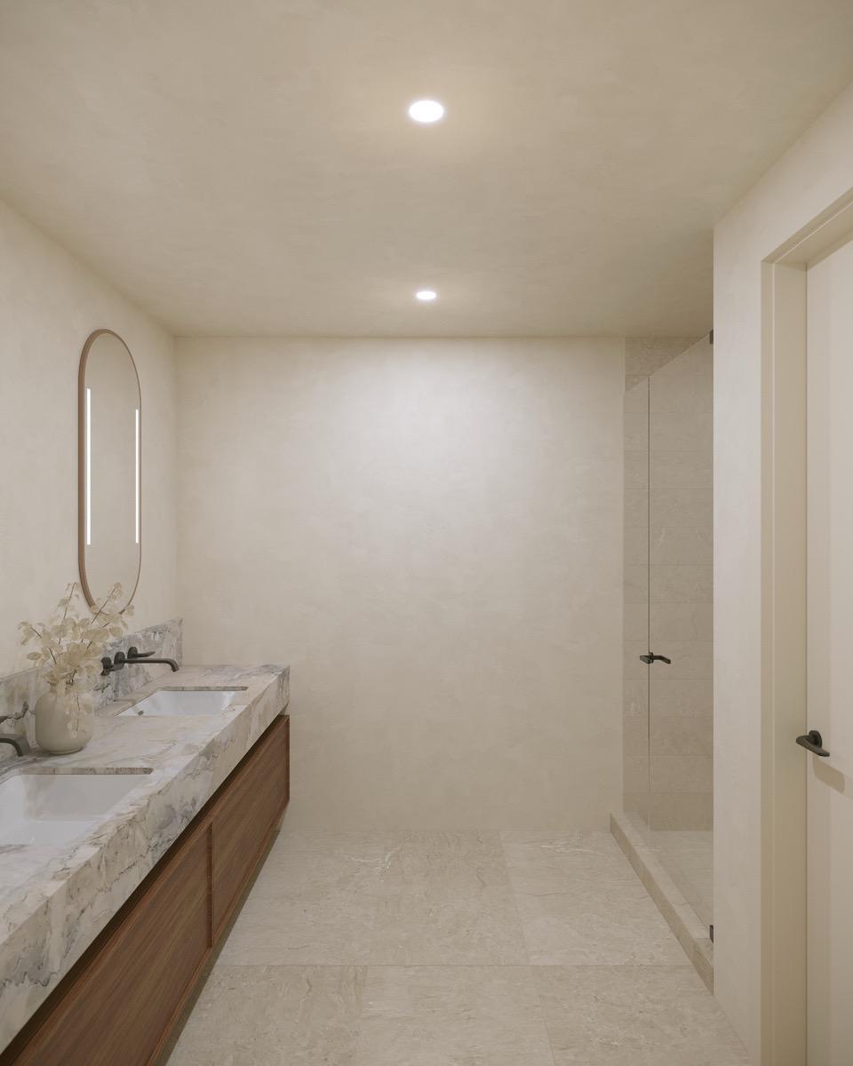 18. Warm Neutral Floor and Wall Porcelain Tile at Secondary Bathroom
