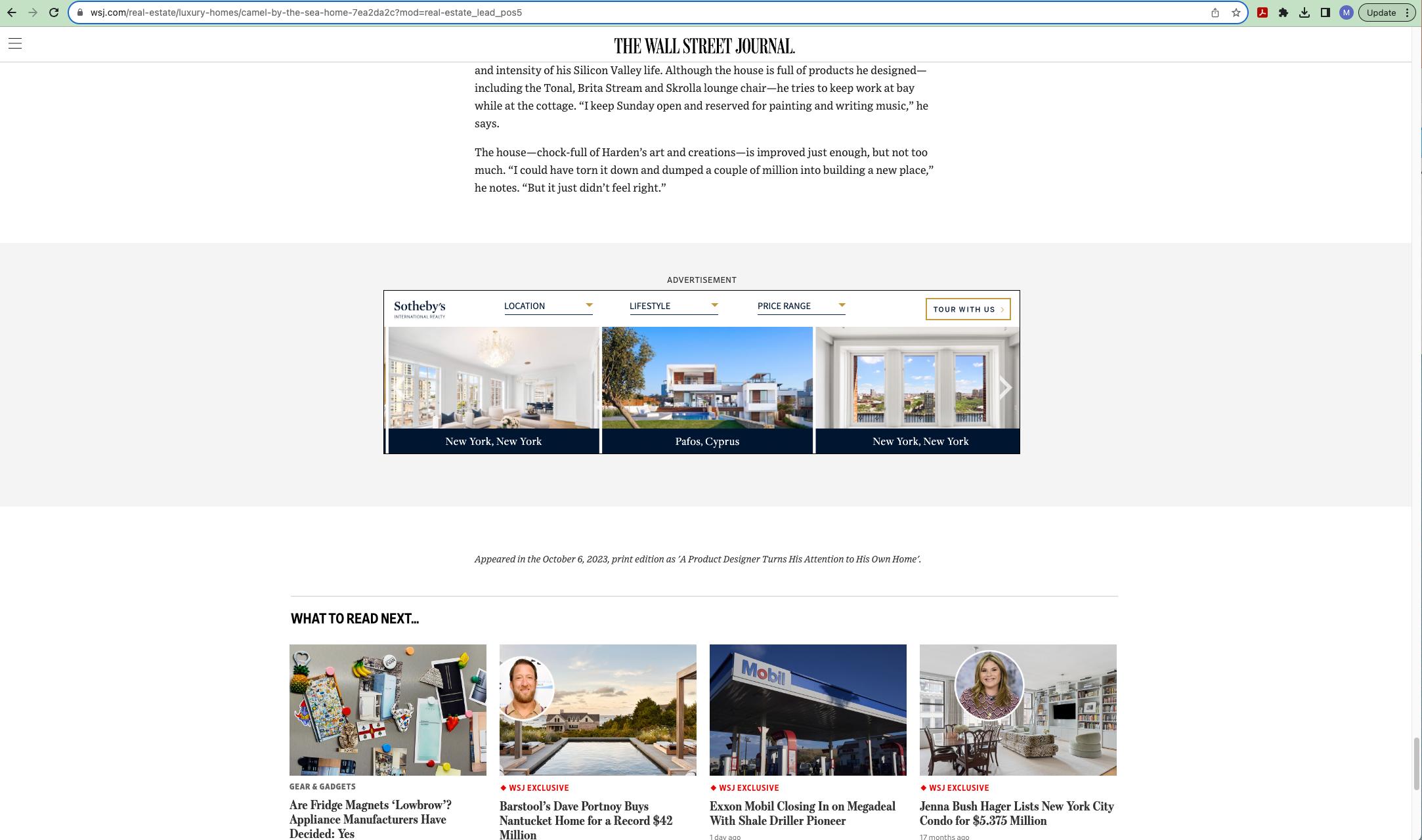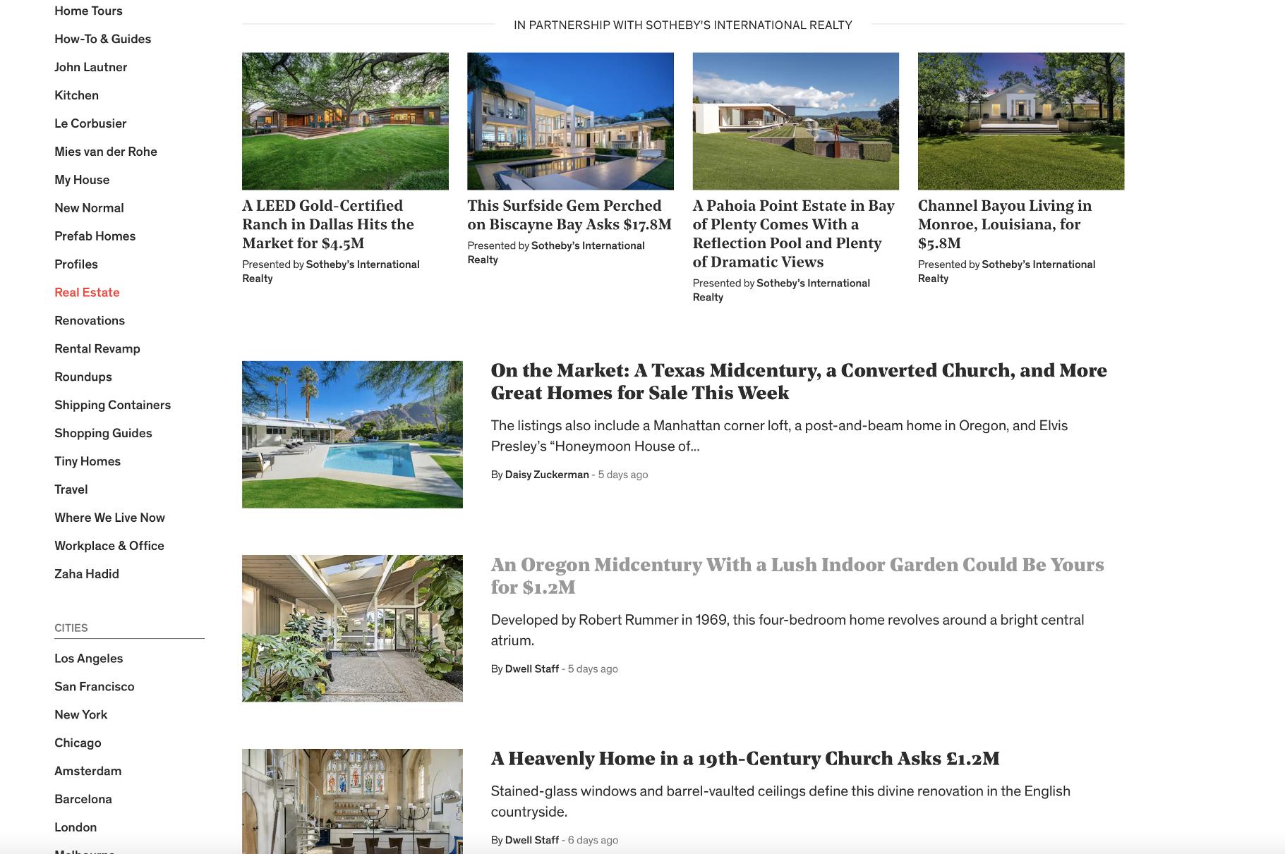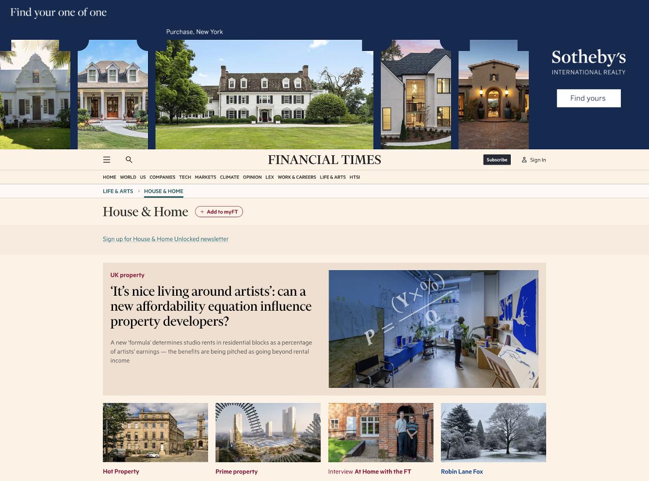 We partner with leading media powerhouses to deliver content to discerning audiences worldwide The Global Property Search (GPS) automatically displays properties based on the location of the consumer as they visit our media partners websites. In 2024 the geo targeting for this unit was expanded to include feeder markets. When a property is clicked by the potential buyer, they are taken to the property details page on sothebysrealty com The GPS ad unit is active on 11global websites: Architectural Digest, AD Mexico, BBC, Dwell, Financial Times, LeFigaro, Luxury Estate, Nikkei, PropGoLuxury, The New York Times, and Wall Street Journal.