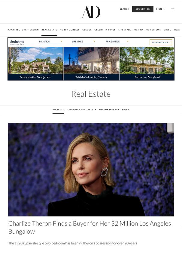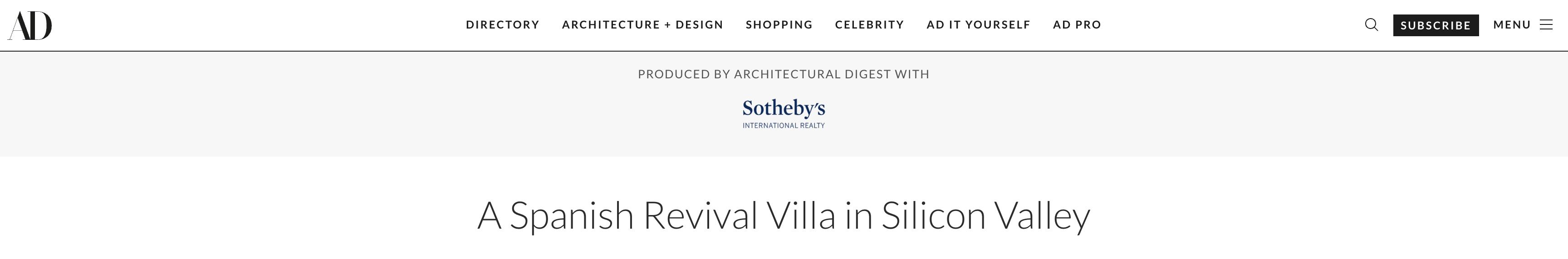 The Architectural Digest Property of the Month series showcases a standout Sotheby?s International Realty listing in a high impact way.Each feature includes a richly visual editorial article complemented by targeted social promotion to maximize reach and engagement.