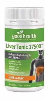Please note complementary health products do not replace a healthy lifestyle or claim to cure or treat any disease(s). Add these products to your overall healthy lifestyle for optimal benefits Available at: Clicks Stores, Health Shops, Pharmacies & Wellness Warehouses throughout South Africa www.wellnesswarehouse.com I www.faithfultonature.co.za I www.ingoodhealth.co.za I www.clicks.co.za Good Health Products (021) 701 5000 I ghpoffice@iafrica.com Liver Tonic 17500TM combines the potent liver protecting and cleansing herb, Milk Thistle, with a comprehensive blend of herbs and nutrients to create an effective liver tonic. Key antioxidants help protect the body from liver damage and support the regeneration of liver cells. Optimal liver function is essential for the maintenance of general wellbeing. Liver Tonic + antioxidants - protects liver and improves healthy digestive function Key Benefits • More energy • Rejuvenating after indulgences • Rejuvenating after stressful periods • Supportive of fast paced lifestyles • Anti-oxidant protection • Enhances well-being • Enhances digestion and elimination • Combines well with Good Health Multi Fibre Key Features • Milk Thistle and high potency herbs • One-a-day formula for a busy life • Supports vital liver function • Supports the gall bladder • Protects against free radicals • Supports cholesterol reduction • Rejuvenates the liver Key Indications • Daily liver detoxification for hangover prevention • Digestive complaints – constipation, diarrhoea, wind, and bloating • Allergy sufferers • Joint pain • General lack of energy, and headaches • Skin problems – acne Antioxidant Vegan Liver Tonic Healthy digestion Improve Regenerate Live(r)