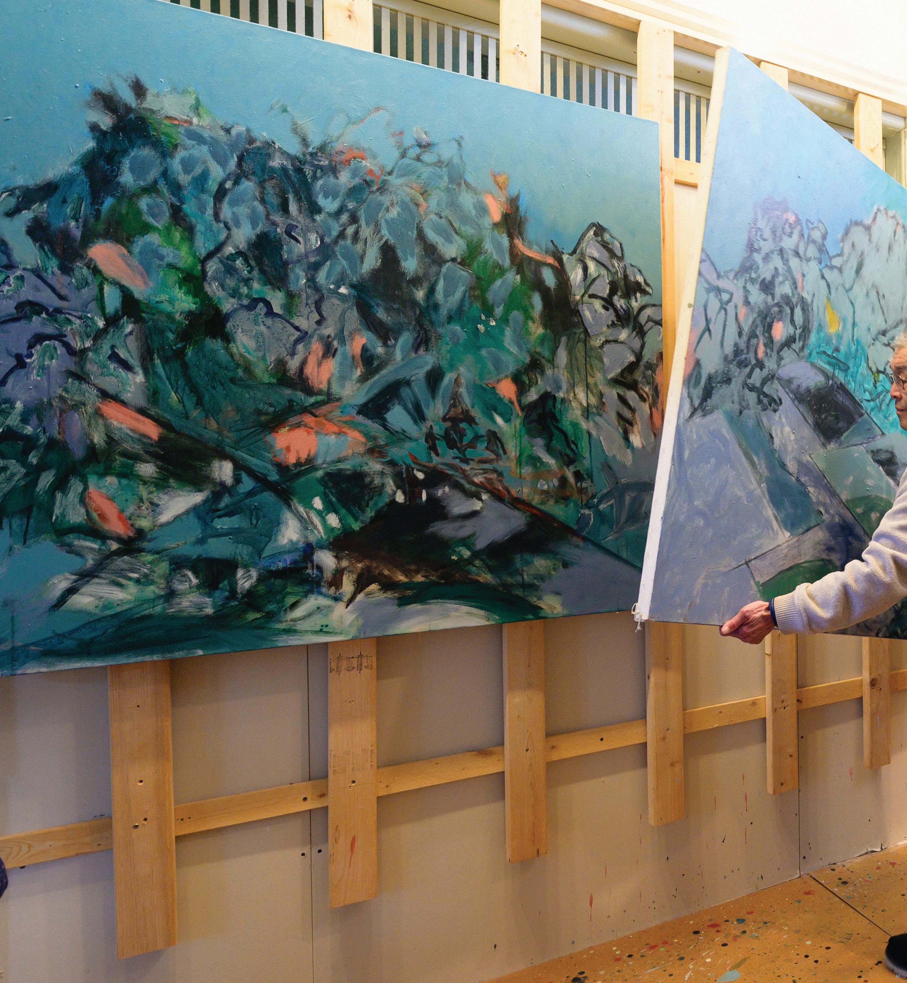 He often works on more than one painting at a time, and it is not uncommon for him to take a painting from his “finished” wall of paintings to rework or add various thoughts.
