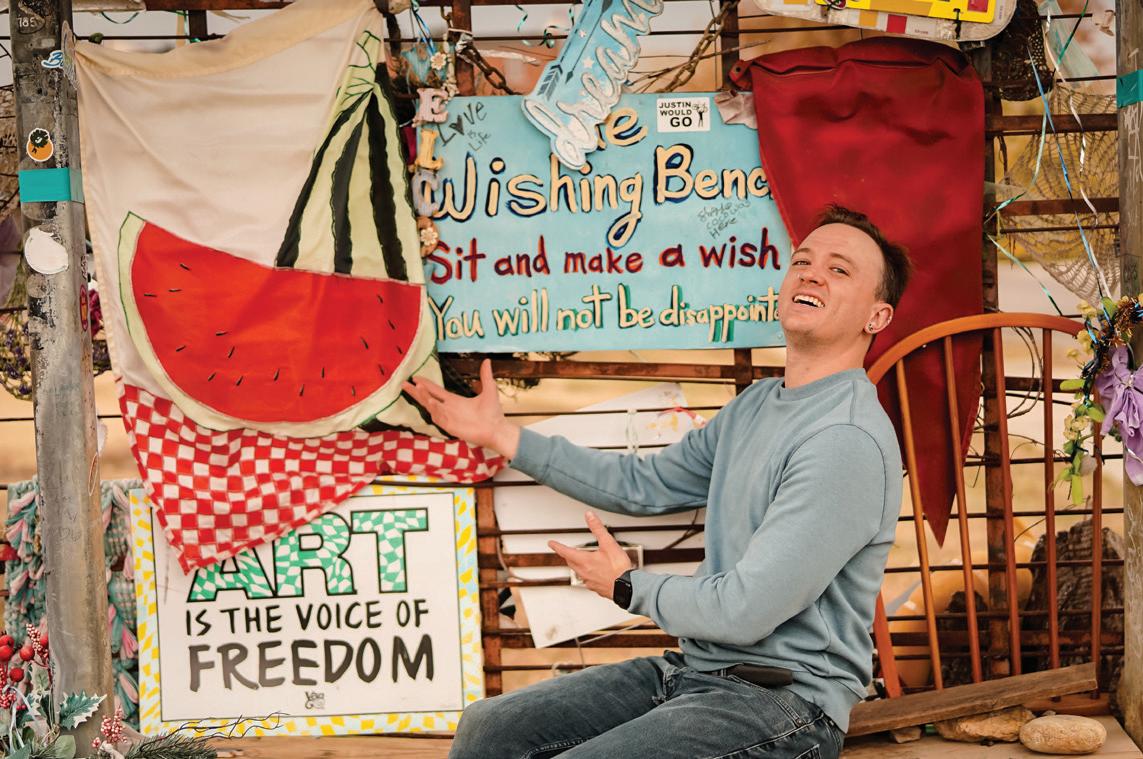 Originally a student project at the University of Kansas around 2007, the Wishing Bench has stood as a public spot that accepts offerings and makes dreams come true (if you believe). A renovation in 2021 made the bench’s platform wheelchair accessible. Volunteers curate and rotate items left behind, ensuring that the bench’s backdrop is always fresh and ever-magical.