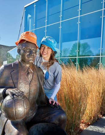 Begun by Lawrence sculptor Elden Tefft and completed and unveiled by his son Kim Tefft in 2016, the statue honors Dr. James Naismith, who is credited with the invention of basketball using peach baskets for the original game in 1891. Naismith, a Canadian who came to Kansas via Massachusetts, also became KU’s first basketball coach, establishing a long legacy of champions.