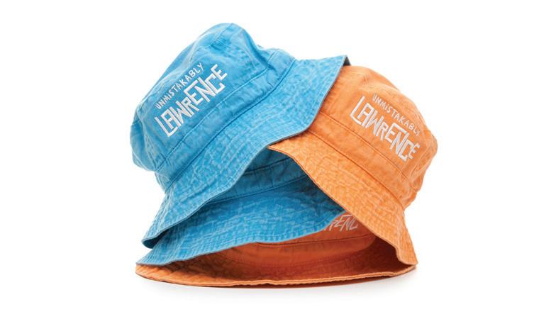 James Naismith (left) and Samantha Laflin sport the Lawrence Passports bucket hats outside of the DeBruce Center on the campus of the University of Kansas. Photograph by Carter Gaskins.