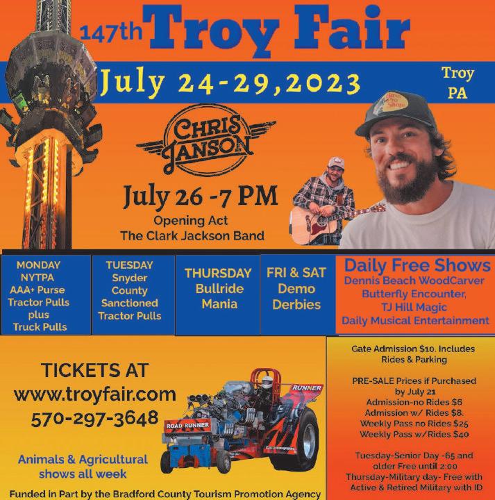The 57th annual Pennsylvania Tioga County Fair is “growing for the future” with rides, games, live performances, demo derby, food and more. Slated for Aug. 5 through 12, the fair can be found at 2258 Charleston Road, Wellsboro.