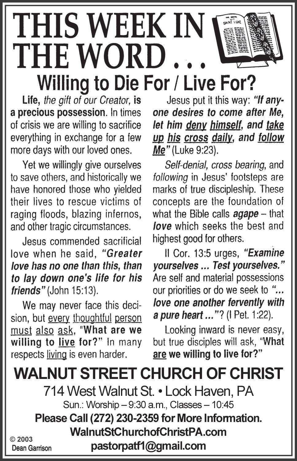 Discover the joy of worship at Walnut Street Church of Christ, 714 W. Walnut St., Lock Haven. The church welcomes all walks of life for fellowship on Sundays at 9:30 a.m., a variety of ministries and programs, and Bible study online via Zoom, every other Wednesday at 6:30 p.m.