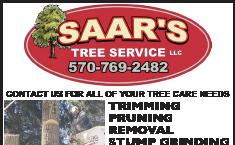 Saar’s Tree Service is owned by Michael J. and Taryn Saar. The business was started by Michael’s father in 1956, and Michael took over and became president in 1999. Pictured, Saar’s provides services at a residential property removing a tree. Their equipment provides the crew with safety and efficiency in completing the job. They pride themselves on quality of work including clean up. Contact them for any residential or commercial needs at 570-769-2482.