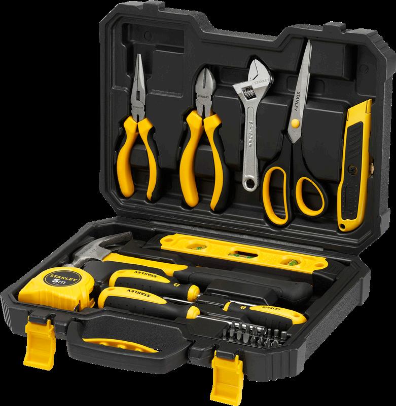 included: long nose pliers, diagonal cutter, wrench, scissors, knife, hammer, tape measure, screwdrivers, 16 bits, water level, case