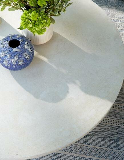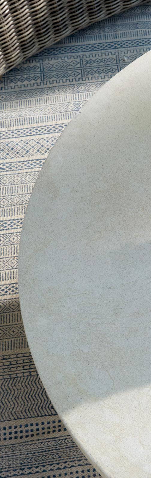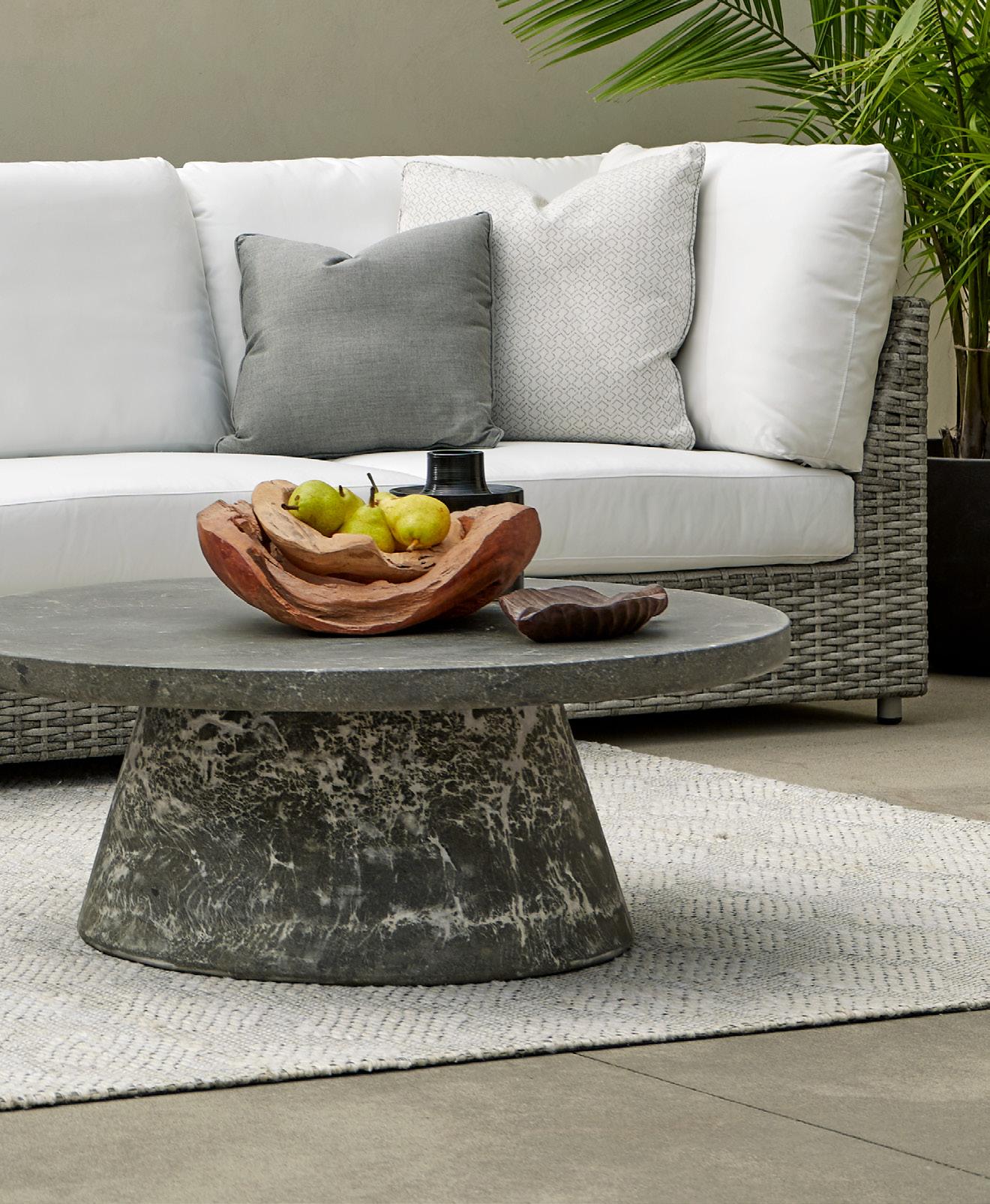 Hand-crafted from crushed lava stone, the tables and table tops feature inherent variations in color, veining, texture and surface details. With a high degree of natural durability, these pieces can live outside in a range of environments. Available in two color choices, the unique characteristics of each pieces should be expected and embraced. No two pieces will be alike.