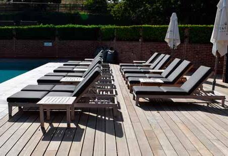 Solution: The decked pool area is flanked on two sides by classic teak Capri Loungers – Base, which are designed to be static. Each lounger has a full-length cushion in water-repellent Charcoal Sunbrella® fabric and each pair of loungers share a Colchester Low Table 54. The informal poolside dining area is furnished with Equinox Chairs and Tables 100, made using 316 marine-grade stainless steel. The tables have teak tops, and the chairs have shaped backs and seats in teak. The teak brings warmth and softness to the contemporary stainless steel with horizontal lines in the loungers and dining furniture that echo the horizontal styling that is evident in the decking and pool house frontage.