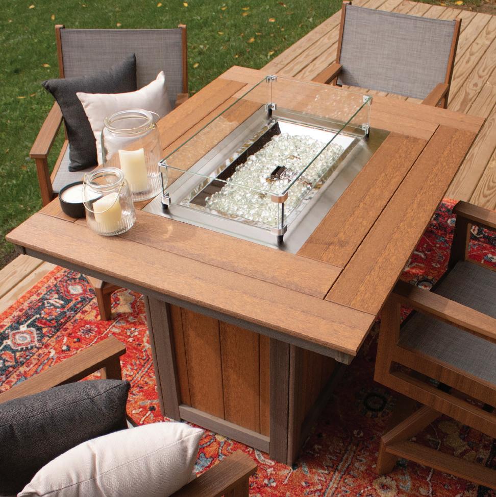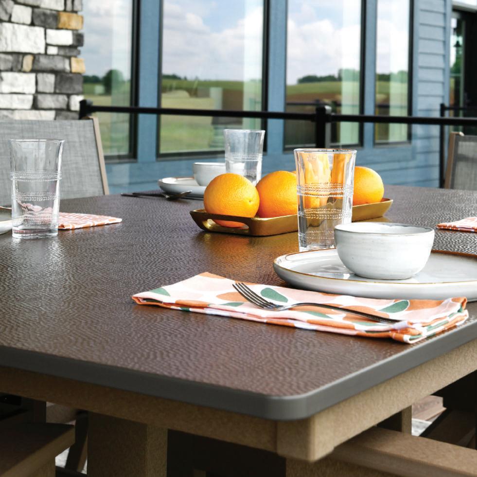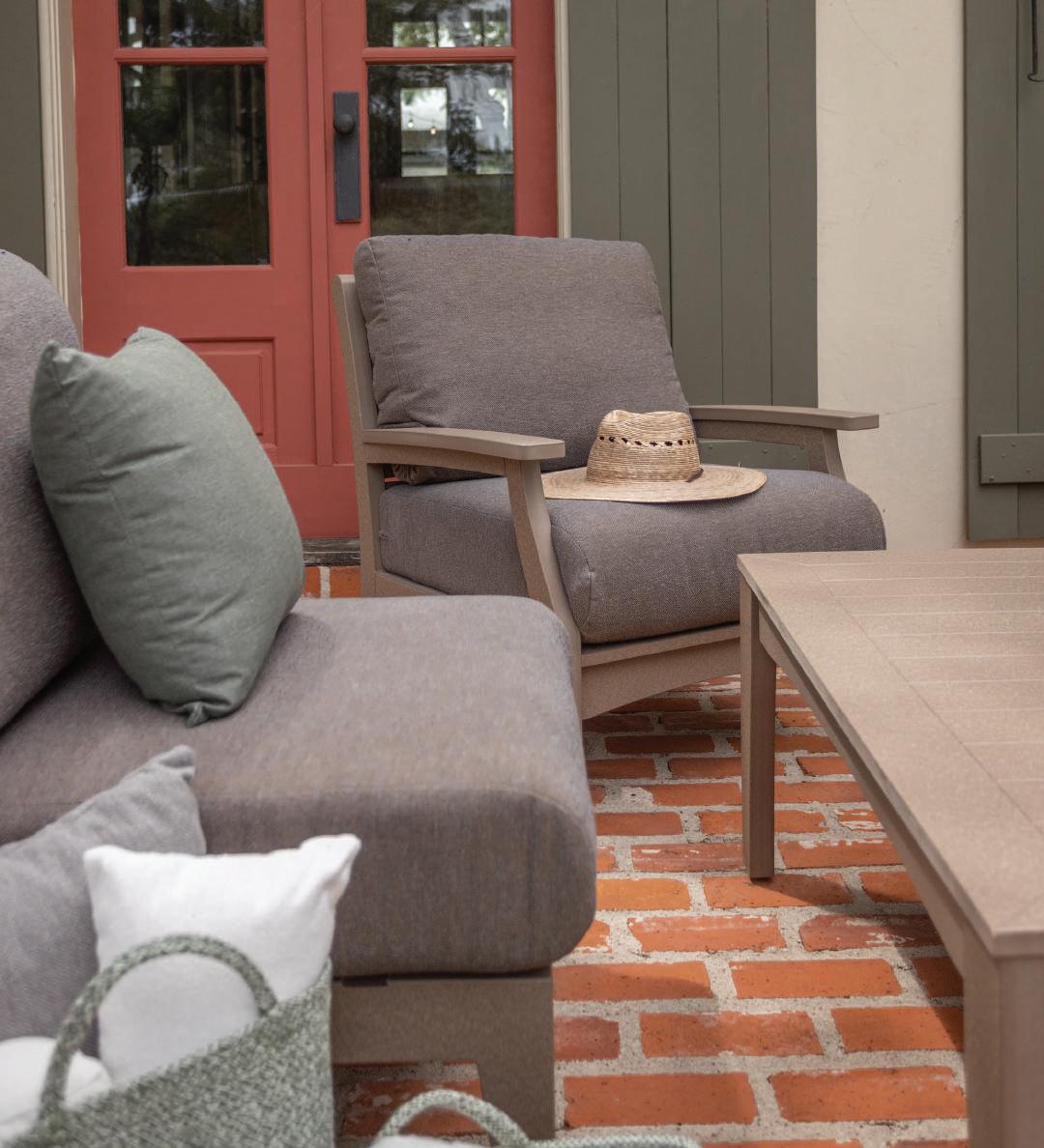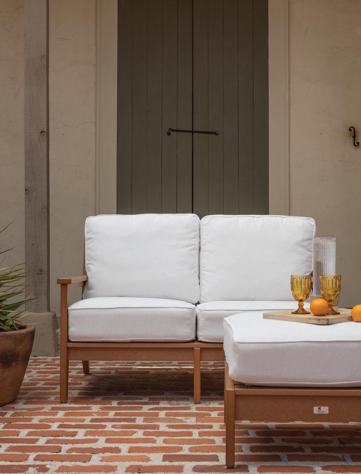 — The Yoder Family(Shown on cover): FRONT: Classic Terrace Sofa and 38" Conversation Table in Brazilian Walnut. Cushions in Rumba Canvas and throw pillows in Comfort Clay, Nurture Clay, and Nurture White. | BACK: Mayhew Loveseat and Ottoman in Cedar with cushions in Nurture White.