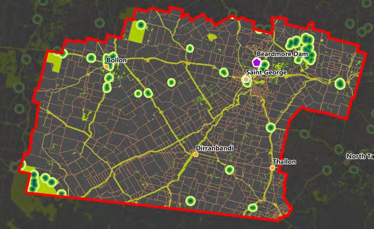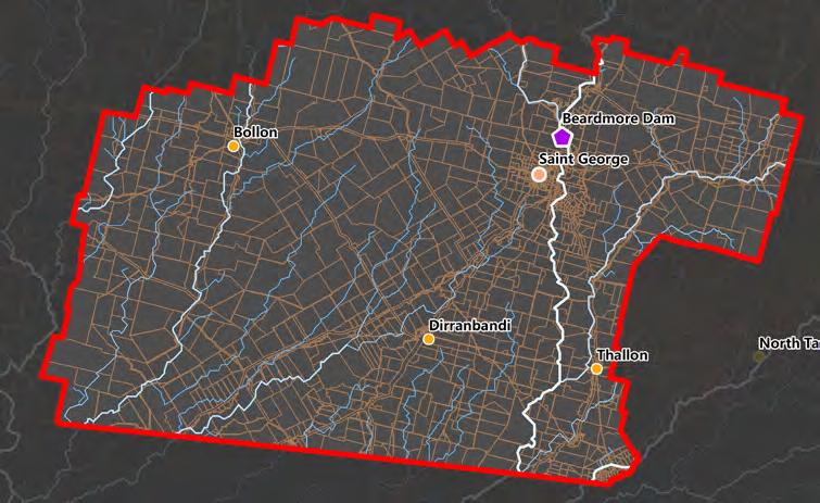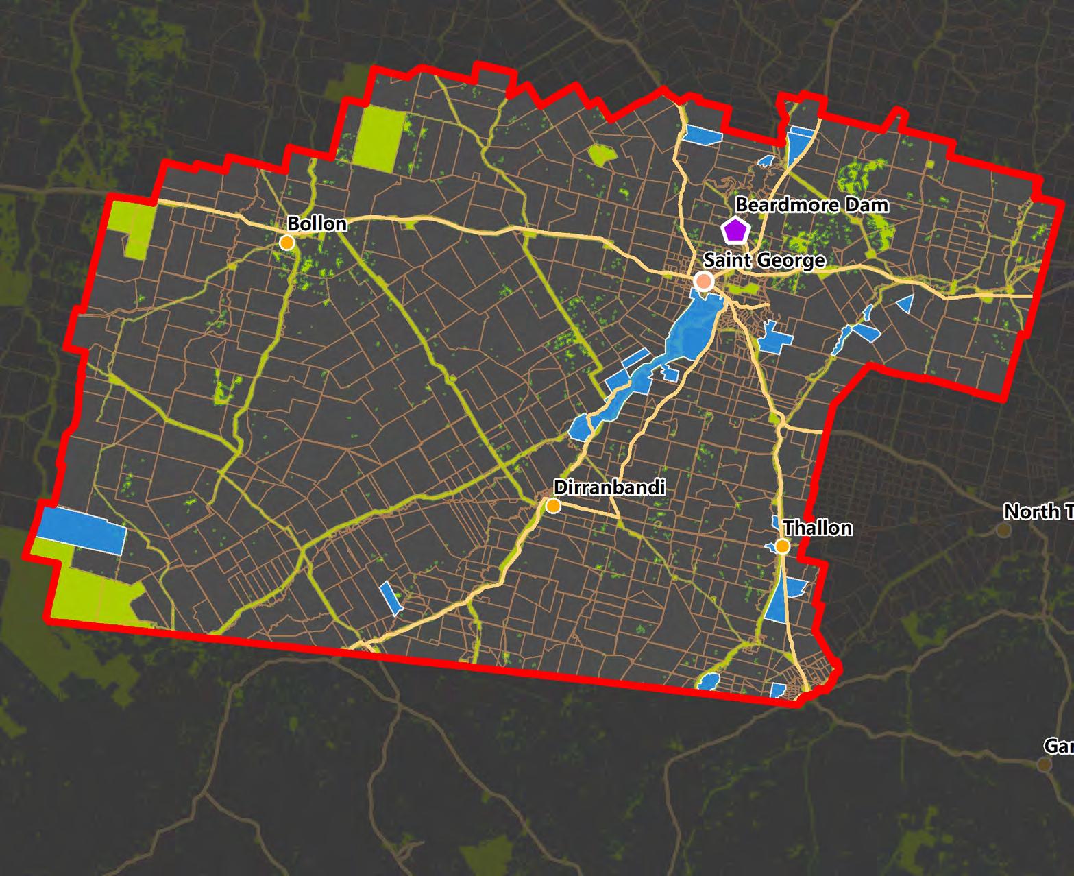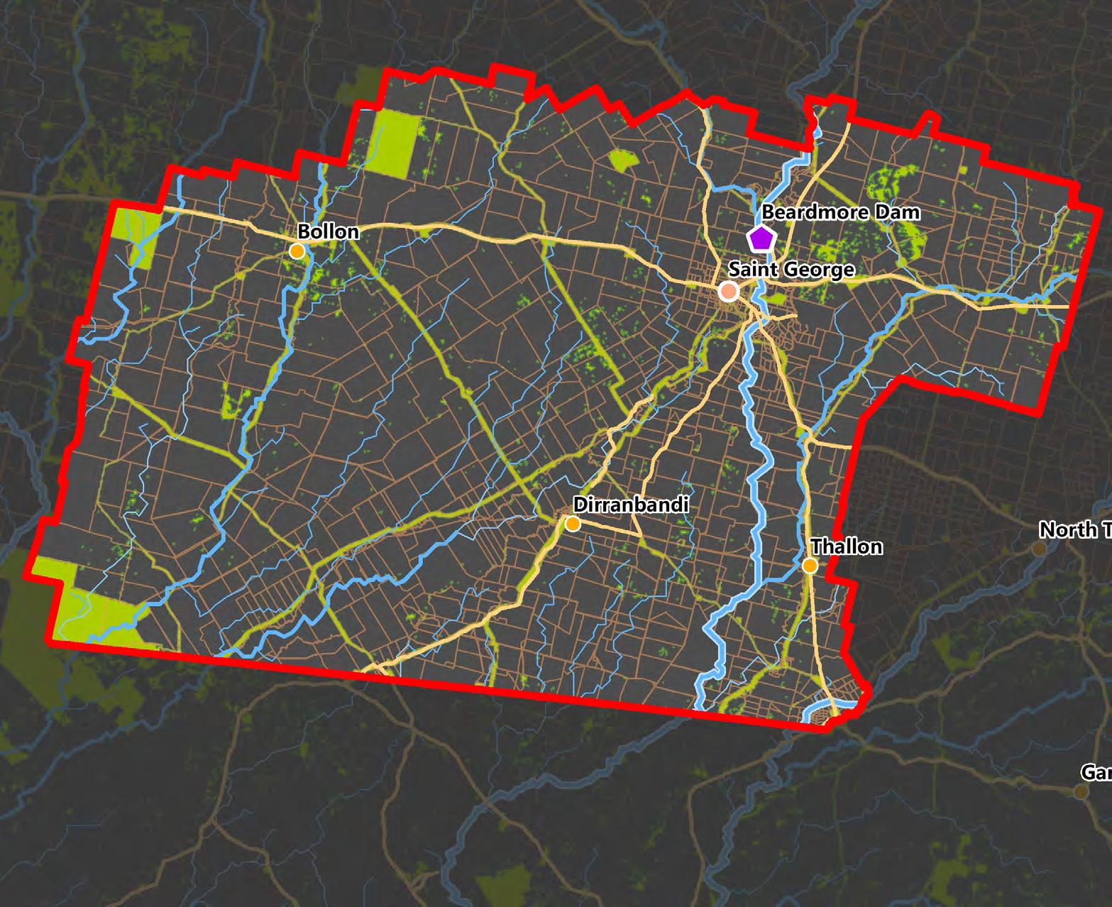 Shire Major Towns Bollon Saint George Dirranbandi Thallon Legend Nature Conservation & Other Minimal Use Major City Form Hydrology streams above 3 Major Roads Boundary of