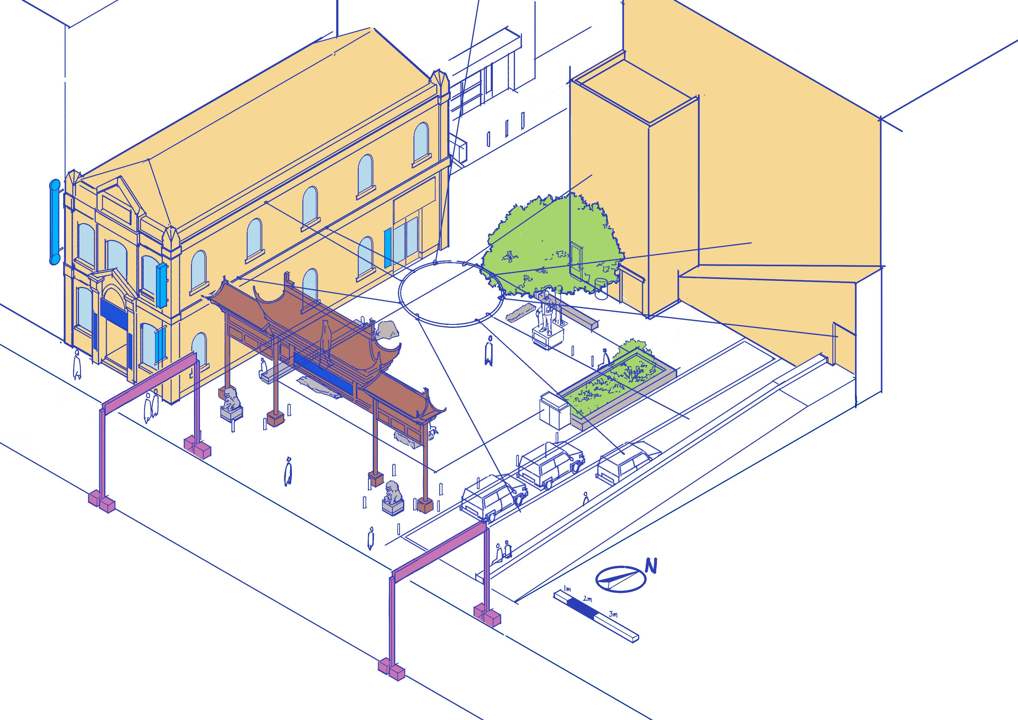 The place's identity is strengthened by the Chinese archway, lanterns, and statue of Dr. Sun Yat Sen. The brick walls as the background of this plaza can be used as a canvas: drawings, posters, and light shows on the wall can contribute to place identity as well.