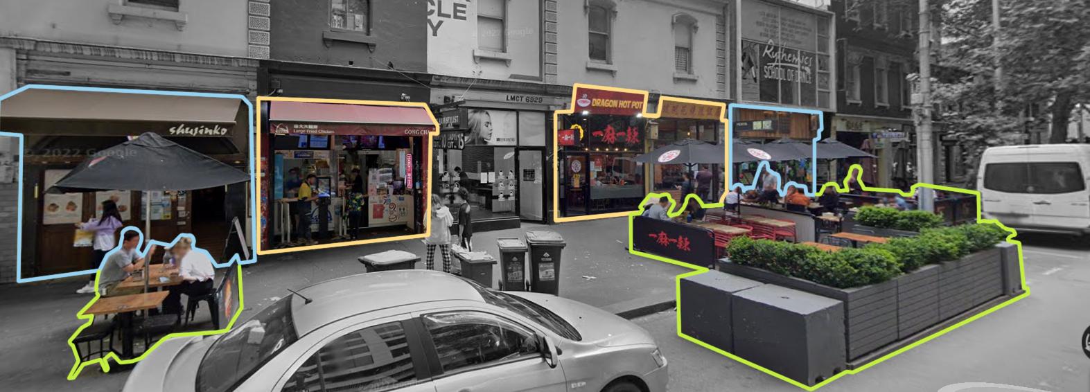 The majority of buildings' height in Chinatown and occupied by Chinese business is under 12m (3 floors), and many of their facade widths are around 5m to 8m. It implies that the building rent is affordable compared to skyscrapers, and the business is on a small scale. The sharp difference can be seen along the east side of Elizabeth street, many skyscrapers have been established, and only a few Chinese restaurants can rent the ground floor to run their business.