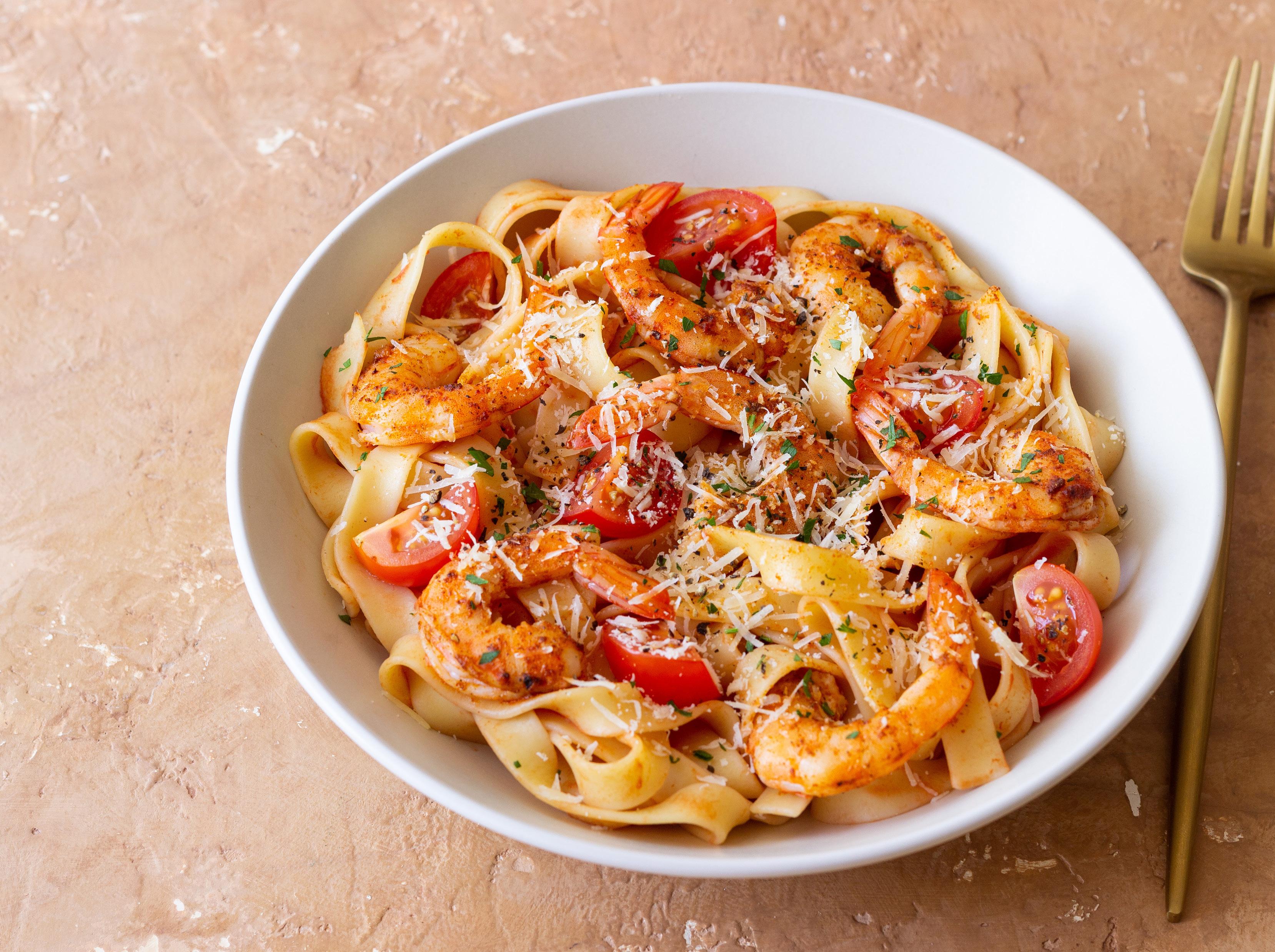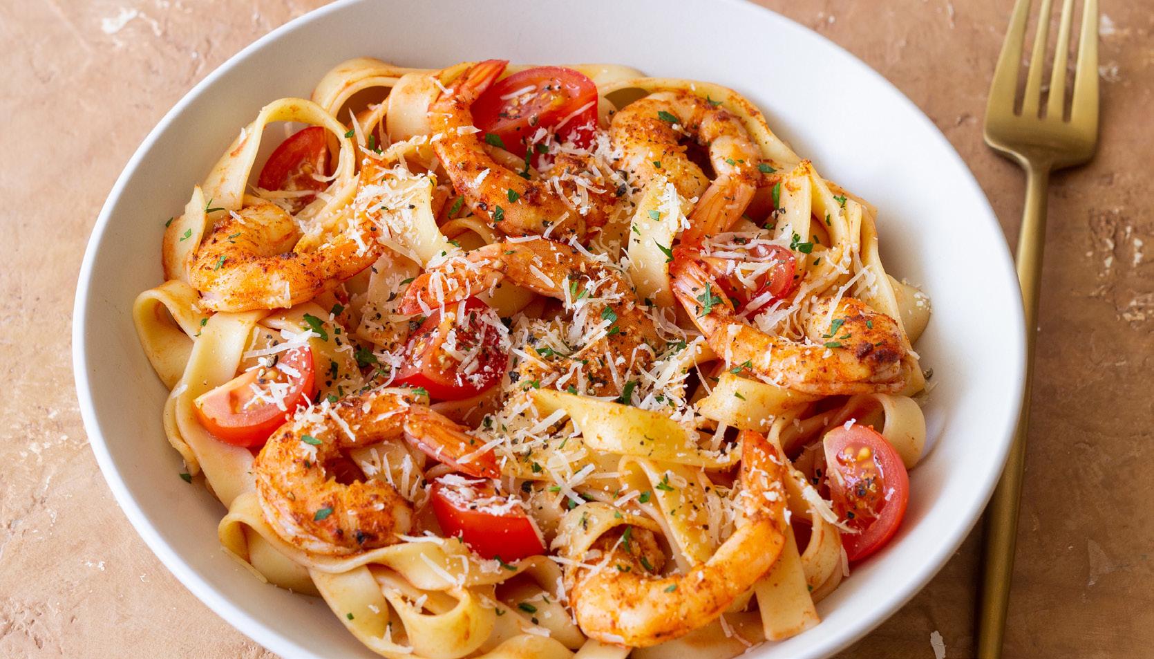 In a large pot of boiling water, add salt and fettuccine, cook according to package directions. When pasta is almost done, heat 2 tablespoons butter and 1 tablespoon Meyer Lemon Infused Olive Oil in a fry pan over medium heat; add shrimp and seasonings. Cook stirring occasionally until shrimp is pink, about 2-3 minutes. Remove shrimp and set aside. Add lemon juice, chicken stock, parsley and tomatoes to the pan, simmer for 2-3 minutes, return shrimp and cook for an additional 2 minutes. When pasta is cooked to your liking, drain and toss with 2 tablespoons Meyer Lemon Infused Olive Oil. Place pasta in a serving dish along with the shrimp and sauce. Top with grated parmesan cheese.