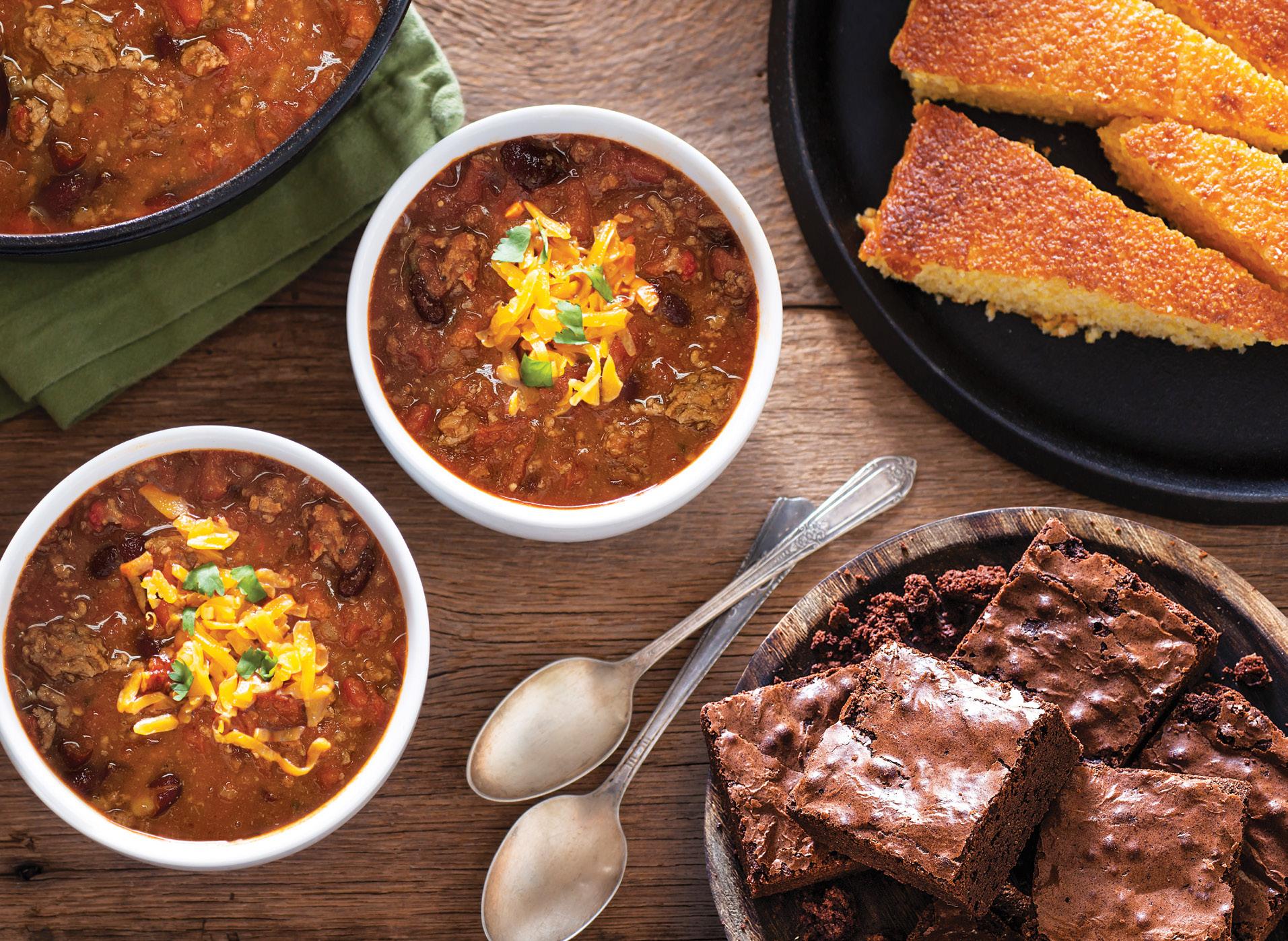 This flavourful feast makes enough for 10-12 servings! Enjoy the rich, savoury chili, the warm, sweet corn bread and the decadent brownies for a complete and comforting dining experience.