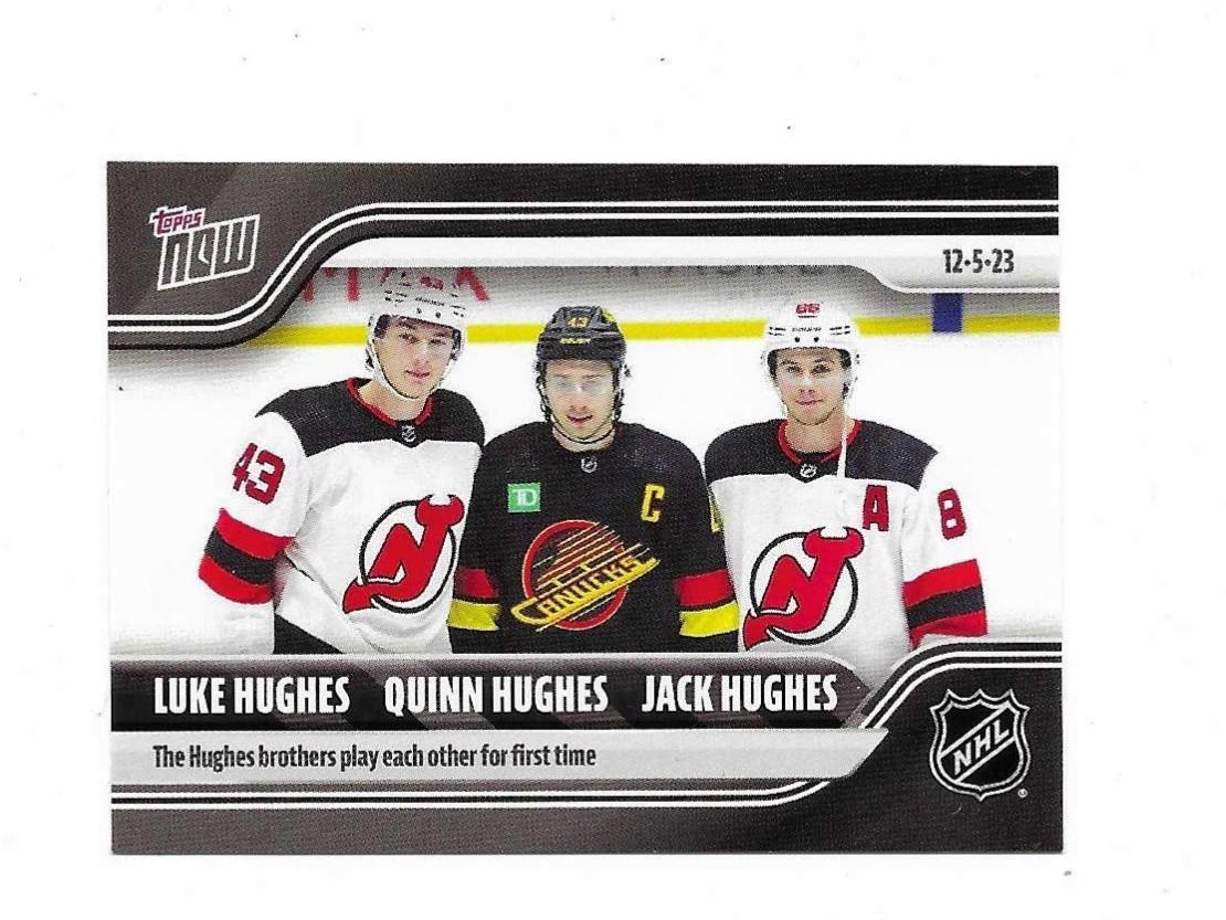 [1] Neil Keller with Jack Hughes (Photo credit to Jeff Friedman) [2] The two 1933 German cigarette cards that we are holding. [3] A 2023 Topps card of 3 Hughes brothers.
